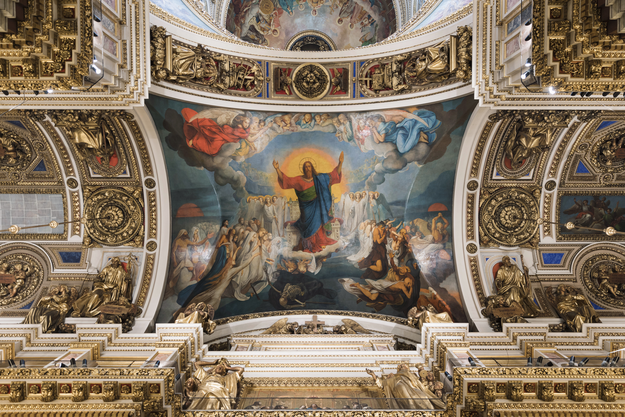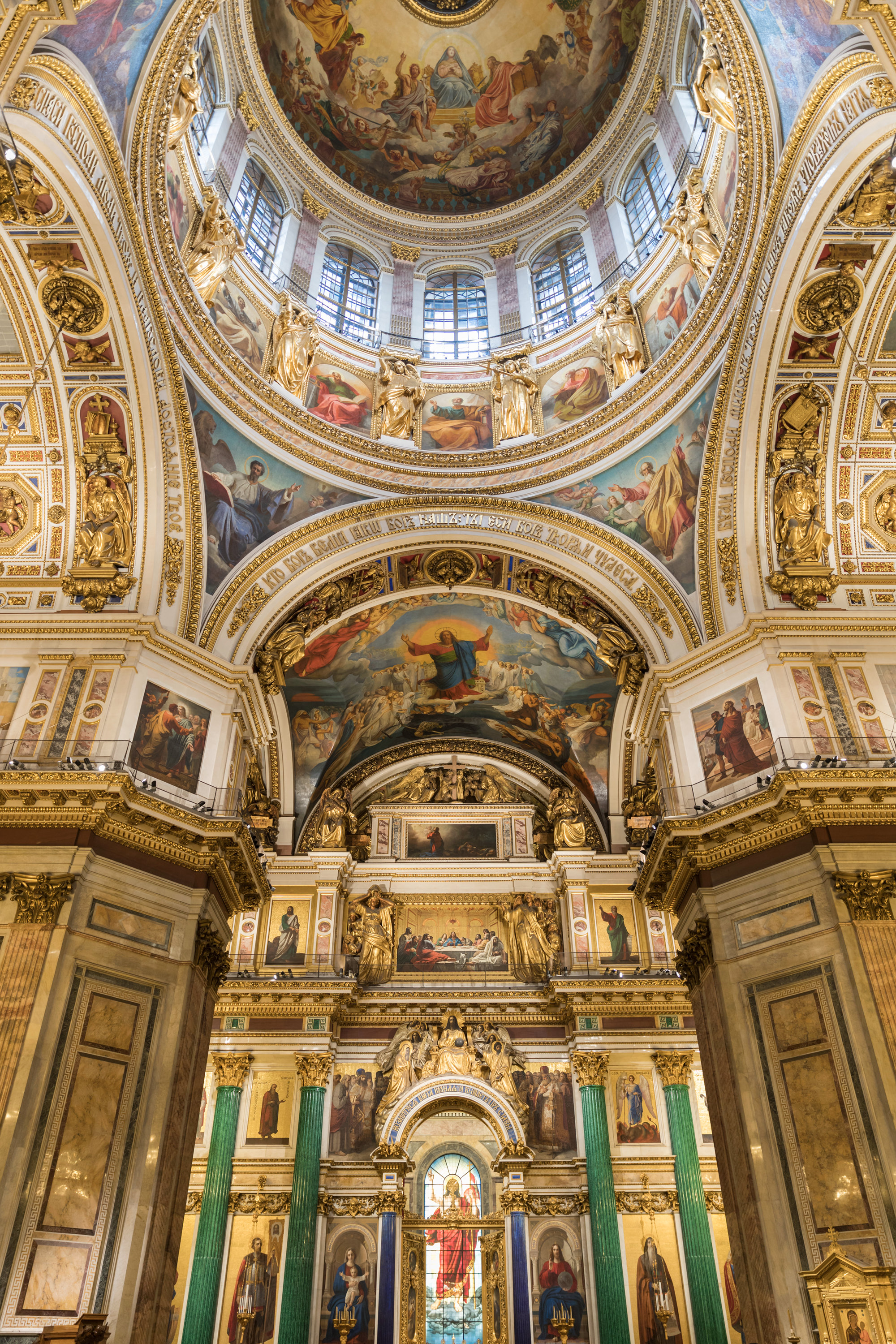 建于1818年,耗时40年,即1858年才建成。教堂高度101.5米,内部面积超过4000平方米。这里最早是1707年建成的木制教堂,之后经历几次重建,现在看到的伊萨克大教堂是第四座。1818年沙皇彼得一世设立比赛重新设计这座教堂,当时是法国建筑师蒙费朗胜出,他使用了坚实的砖石建造教堂,不仅保证的教堂的稳固,而且还很大程度上避免了建筑物收有害降雨的影响。后来继位的尼古拉一世又使用了更为豪华的设计,致使工程延期,基础建设就花了大约5年时间。