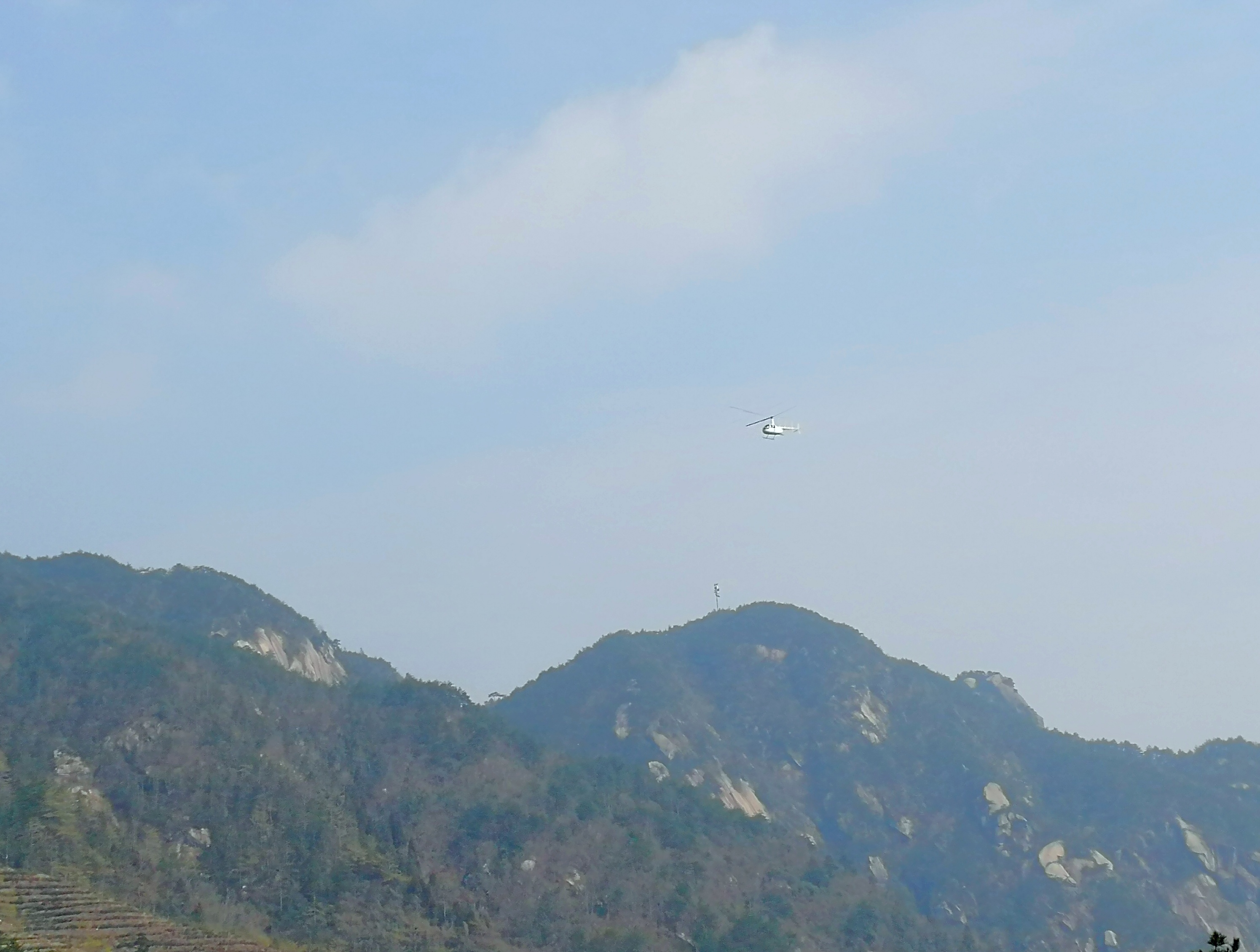 正准备出门步行前往大龙窝索道,天空中响起一阵轰鸣声,什么情况,大家赶紧抬头张望,原来是直升飞机。
