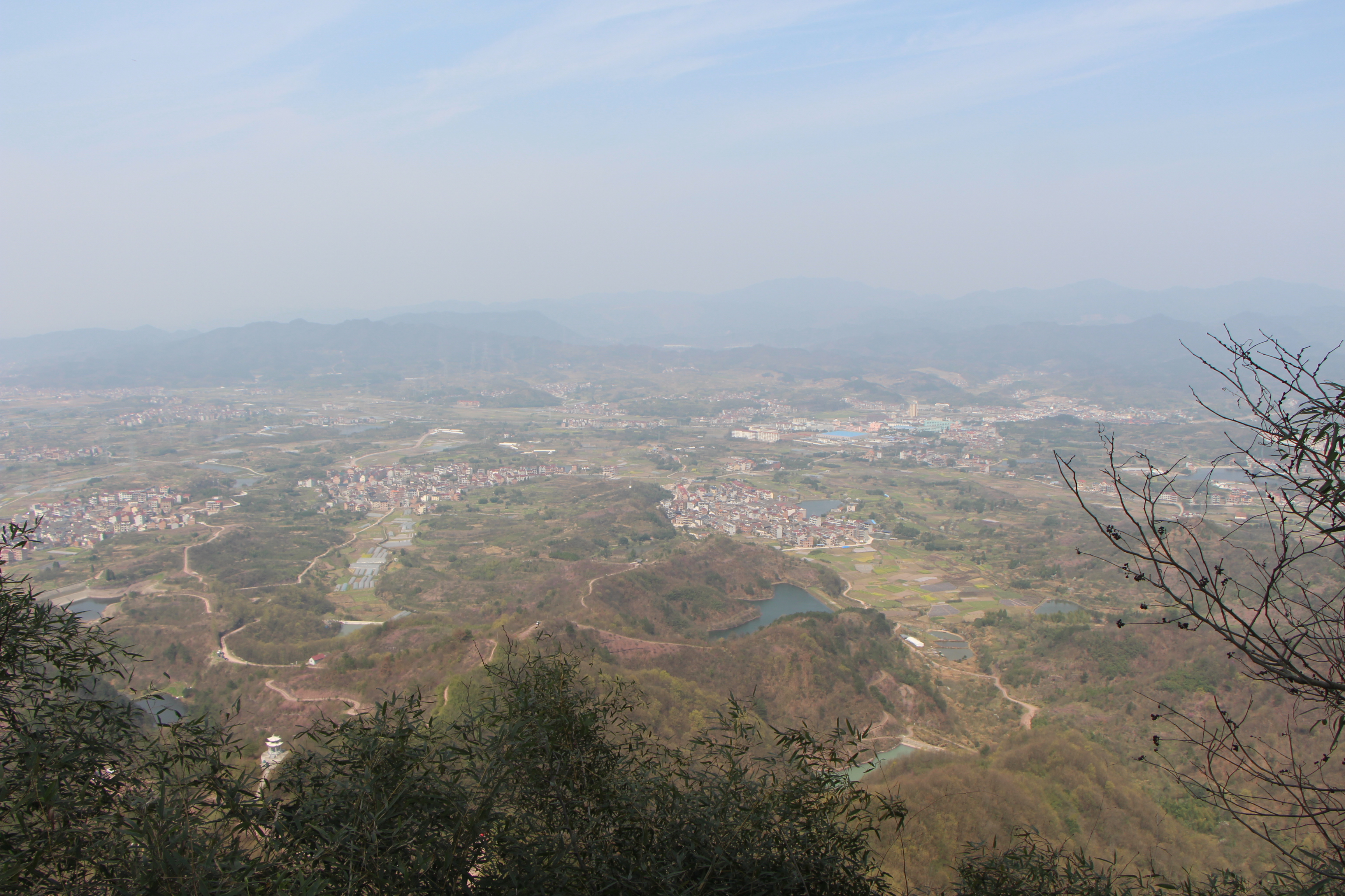 这里的紫荆花海约3平方公里,在梅江盆地的南面拔地而起。站在岩下仰望,很像一个竖起的大拇指;站在岩上放眼远眺,五十里外的洲上村历历在目,碧绿的兰江水如在脚下,山水、田块、村庄星罗棋布,尽收眼底。
