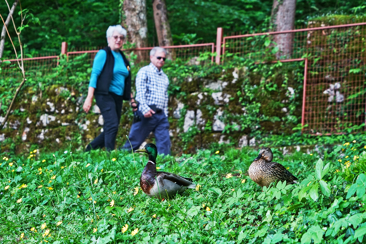 一对野鸭情侣和老人伴侣都在 布莱德 湖畔散步着。。。