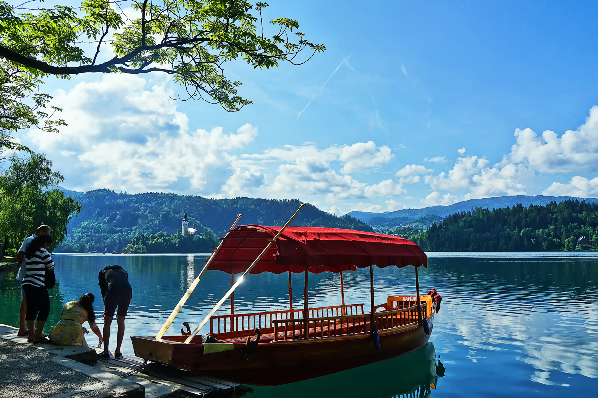 湖畔有各色小船,快艇穿梭而行,游人如织,蓝天白云,湖光山色让人流连忘返。。。美哉! 布莱德 湖!