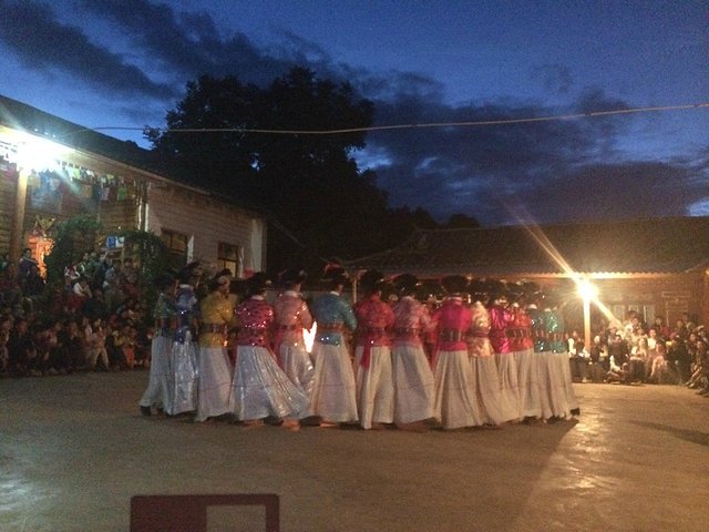 据传古时候摩梭人为了防外敌侵袭,部落首领组织族众在村口烧起一堆大火,人们围着火塘呐喊跺脚。敌人退兵后,众人欣喜若狂,围着火堆通宵达旦的唱歌跳舞,后来便产生了群体娱乐性的锅庄舞。
