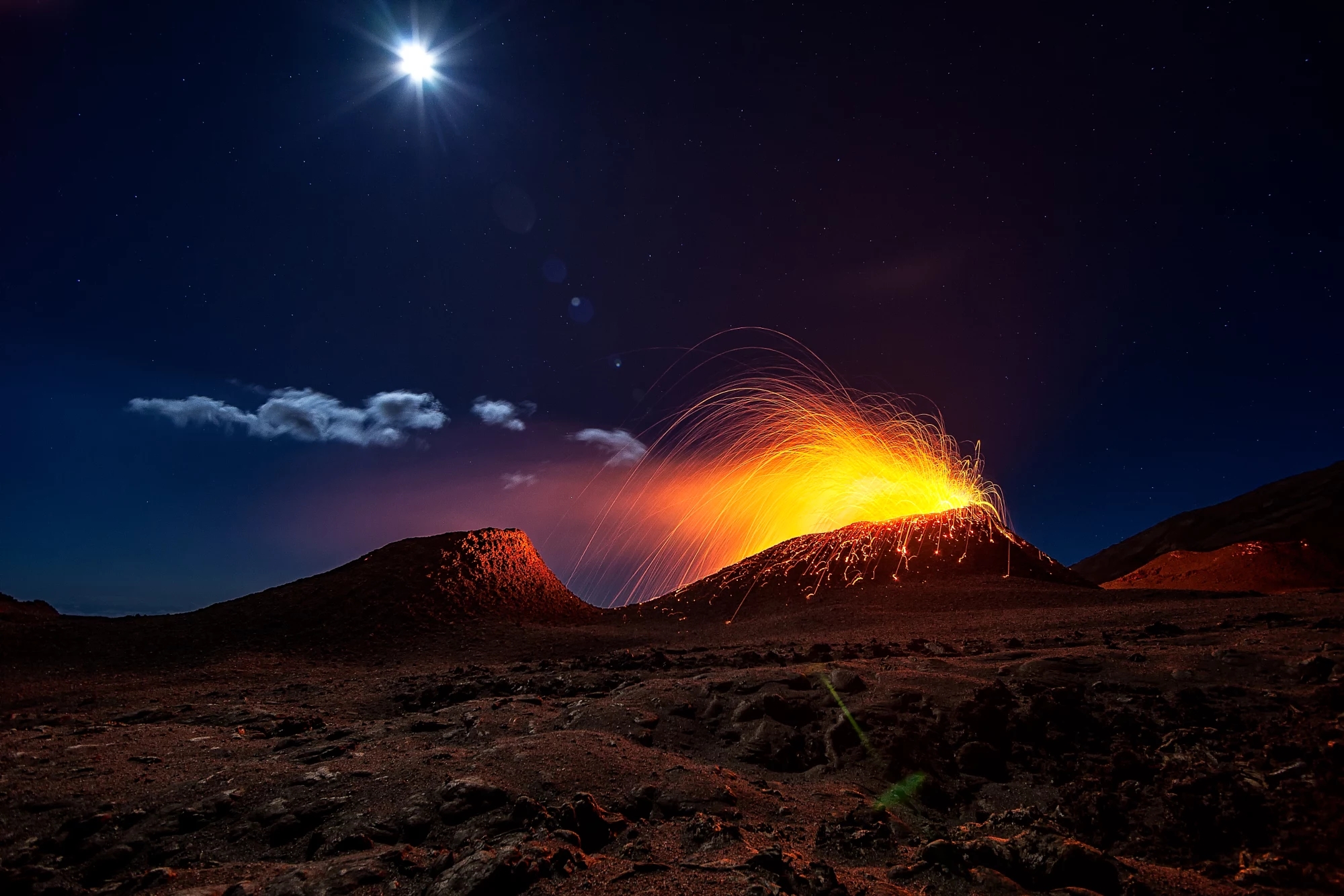 沸腾的岩浆翻腾不息,夜空下,映出一片火红和轰鸣的交响,如万朵礼花绽放,又如流星雨般落下,面对这样的景象,每个在场的人只剩下敬畏和安静,把感叹留给大自然。