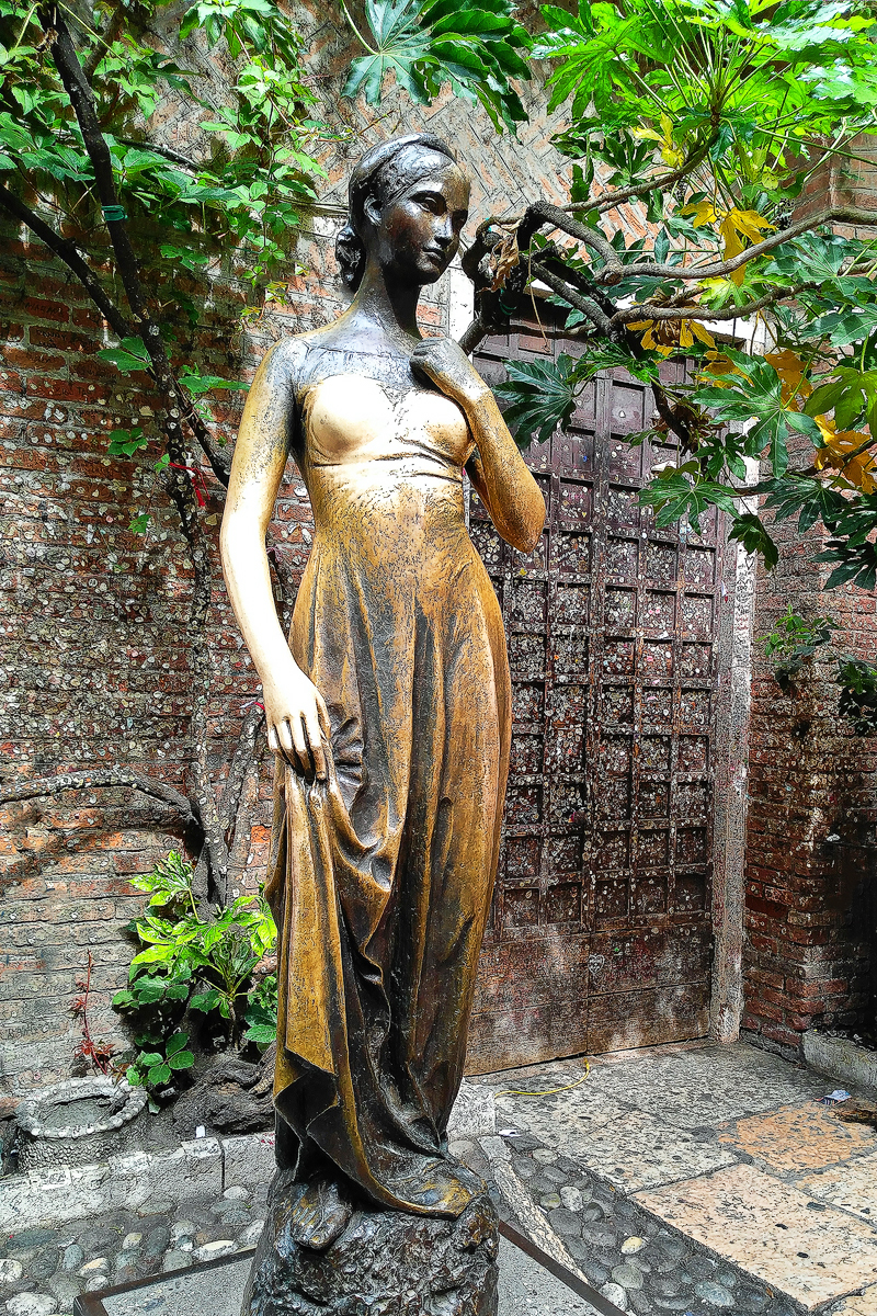 大门正面靠院墙是比真人略高大的朱丽叶的青铜塑像。青春妙龄的朱丽叶身材修长,她的眼神清澈委婉,含蓄幽怨,她的身后也布满了青藤。据传,手摸朱丽叶的右胸许愿,便可得到她真诚的祝福,使有情人终成眷属。游客们把这里当作“爱的圣地”,从世界各地慕名而来。
