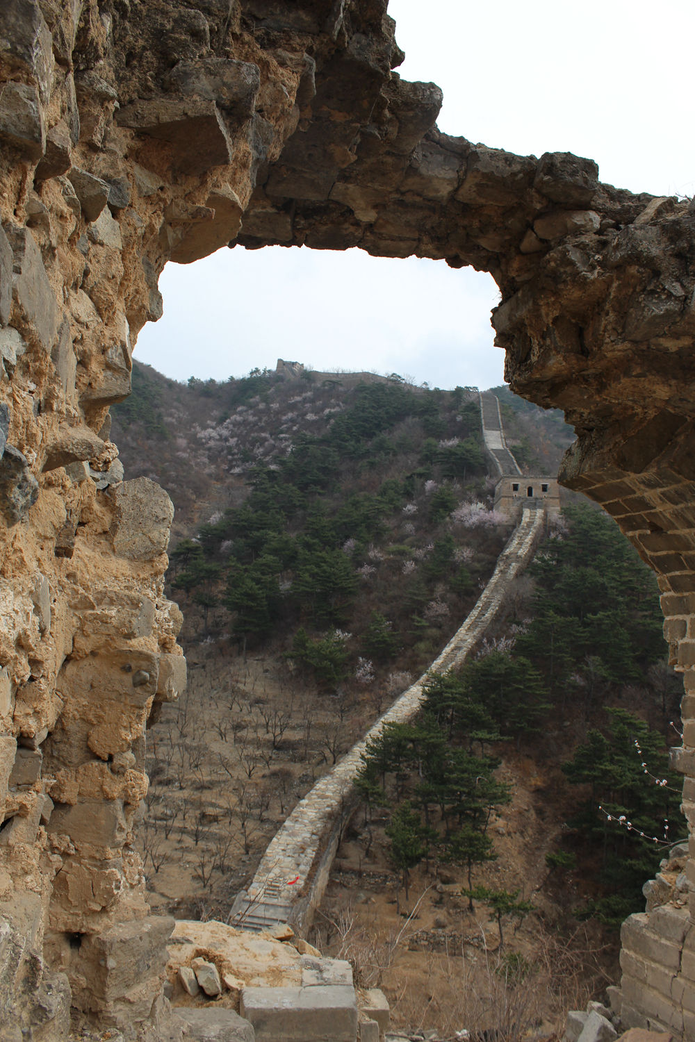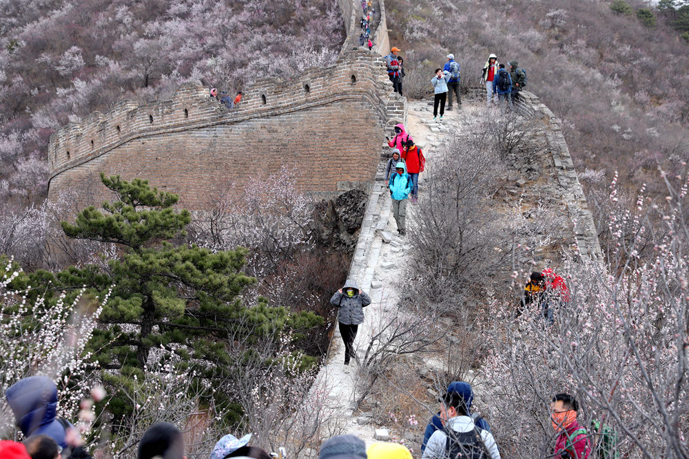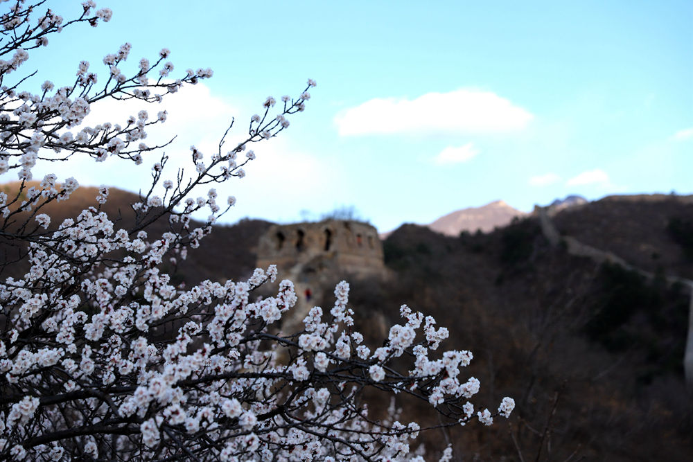 四月的撞道口以野杏花出了名,从城牆一直椅到天边,漫山遍野的杏花、桃花,为坚毅残破的长城增添了一分娇柔。