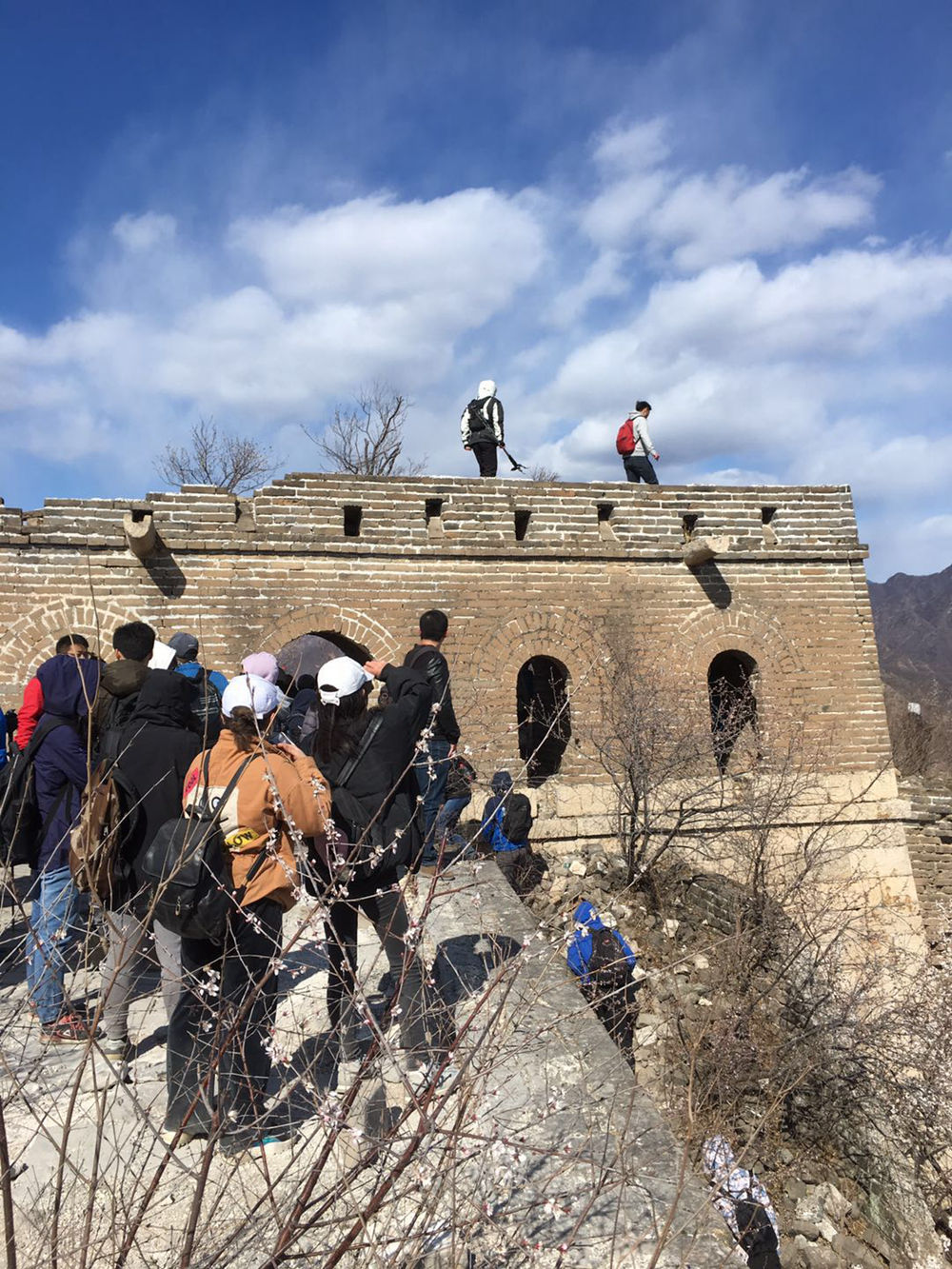 一路沿著大石块下坡返回,踩在曾为防御倭寇的牆面上,但是已没有了历史的硝烟,有的只是来自现代都市人户外旅行的脚印。返回途中带大家穿过一片杏花林,结束了一天的行程。