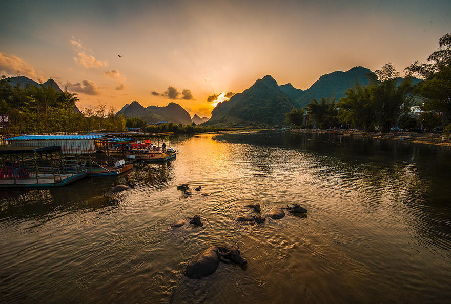 紫壁樵歌--位于旧州风景区南2公里,处平(田东平马)龙(靖西龙邦)公路右侧200米,是一座石灰岩山林,山上悬崖峭壁,呈紫色,山周围浓荫绿盖,半山腰的石壁上刻有“紫壁樵歌”四个大字,为明人所刻,石壁下还刻有一首诗歌,相传古时有一樵夫,善唱山歌,天天来此打柴唱歌,久之,人们都来此聚集对歌,形成歌圩,因山壁色紫,故称“紫壁樵歌”,为靖西有名的八景之一,有“紫壁樵歌赏阴雨”之称。