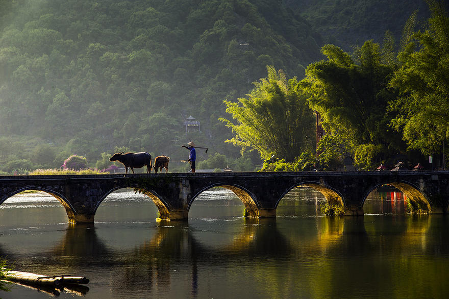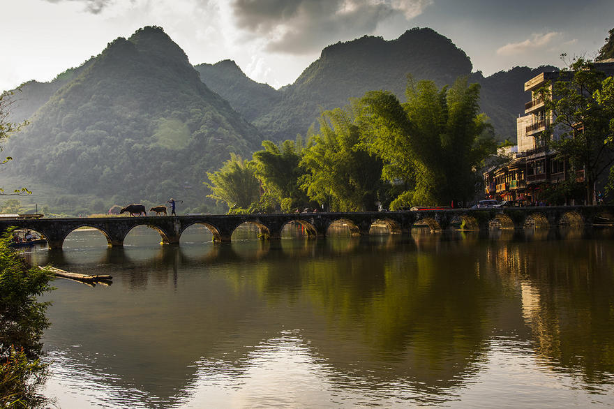 古桥---古桥是鹅泉风景区的—个胜景,古桥建于清朝年间,桥长约60米,宽1.5米,全为石灰 料石组成,是由15个 涵洞的石拱桥组成,长桥卧波,景色优美,气势壮观,鹅泉古桥为靖西县保留得比较完整的古桥。