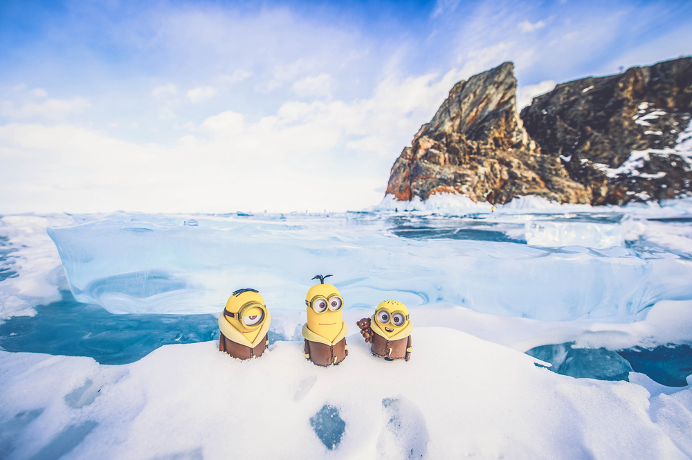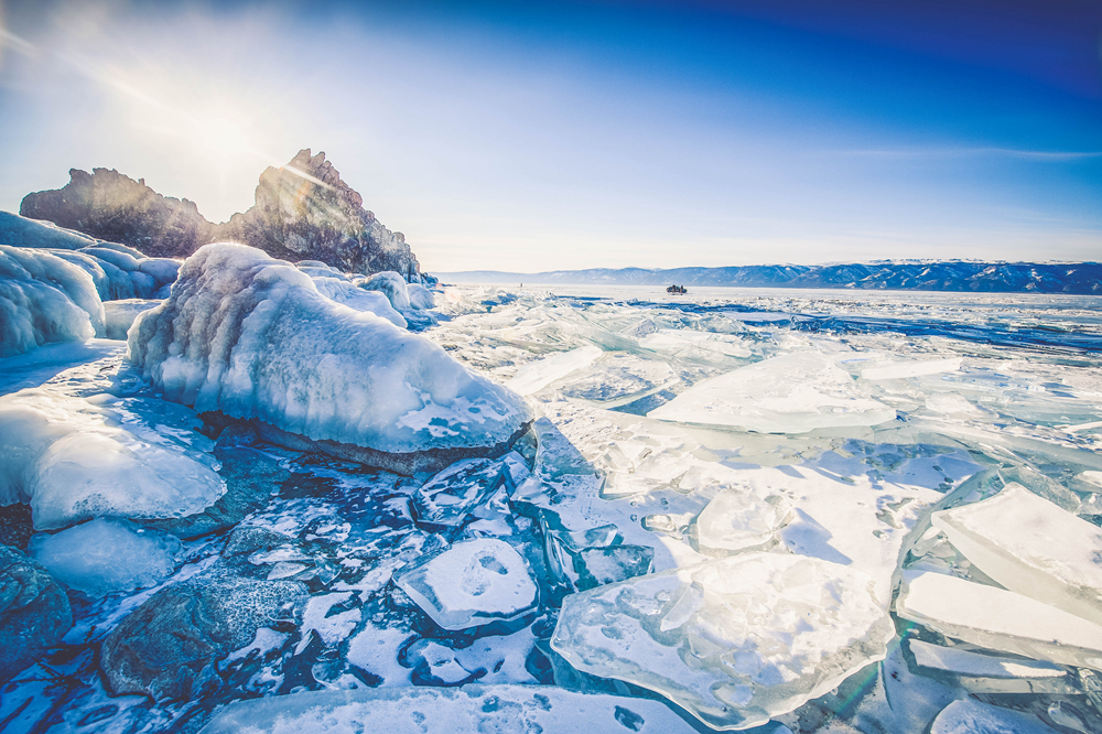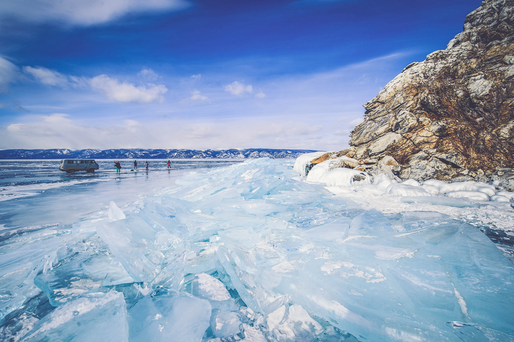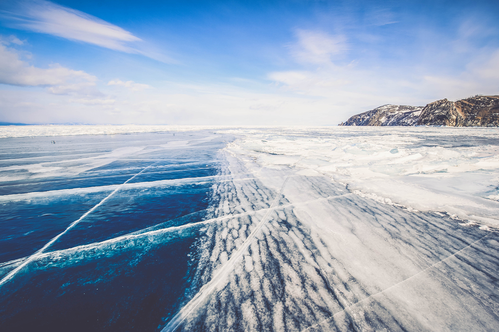 用任何语言来形容被蓝冰所覆盖的贝加尔湖都是贫乏的,人类1/5的淡水被封冻在这片冰蓝之下,站立其上,如浮于一片深不可测的幽蓝之上。在那些岸边的大块岩石周围则形成了大片的冰挂,甚至还形容了冰洞。冰封的湖面并非一平如镜,在很多地方都有大片的起伏,还有一片片如同切割过的玻璃一样的冰片。而最吸引你目光的依然是那长长的白色裂痕,它们深至冰层深处,延伸向无尽的远方,危险而又美丽。