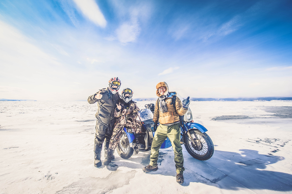 中午时分我们的车拐进了一个背风的角落,这里已经聚集了好几辆“装甲车”,我们的午餐是司机准备好的烤鱼、土豆泥、面包和奶茶,简单,却又美味而且高热量。而我的目光被一辆三轮摩托所吸引,载着鼓鼓囊囊装备的蓝色摩托在空旷的蓝色冰面上是如此诱人,蛊惑着你跨上去,驱动引擎,和心爱的人一起直至世界尽头——那是一个穿着迷彩的俄罗斯妹子和她的男友,他们愉快地和我们闲聊,然后在我们艳羡的目光中远去。