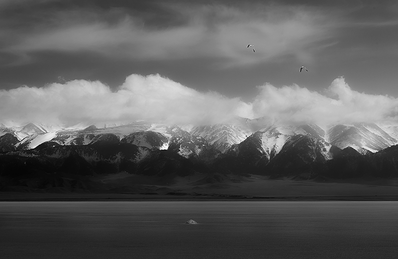 早春的赛里木湖,几乎还是被厚厚的冰覆盖着。下午天气晴朗,冰面在蓝天映衬下,碧蓝碧蓝的。清晨,远处的雪山,近处的冰水,在朝阳的照射下,闪着金光。这是“大西洋最后的一滴眼泪”,像亭亭玉立的少女,宁静、美丽。