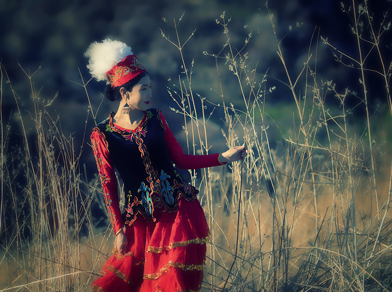 有花总是离不开美丽的姑娘,两位盛装的维吾尔族美丽姑娘,在杏花丛中,翩翩起舞。