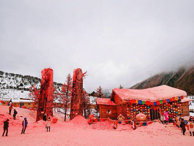 大家都被这粉色雪萌化了那股少女心,虽然是人工染的粉色雪,但任何女孩都不能拒绝的粉色,所以在粉色雪地上拍照,玩耍嬉戏的小姐姐特别多。如果觉得冷了,还可以到小木屋里面点上一杯热饮料喔~