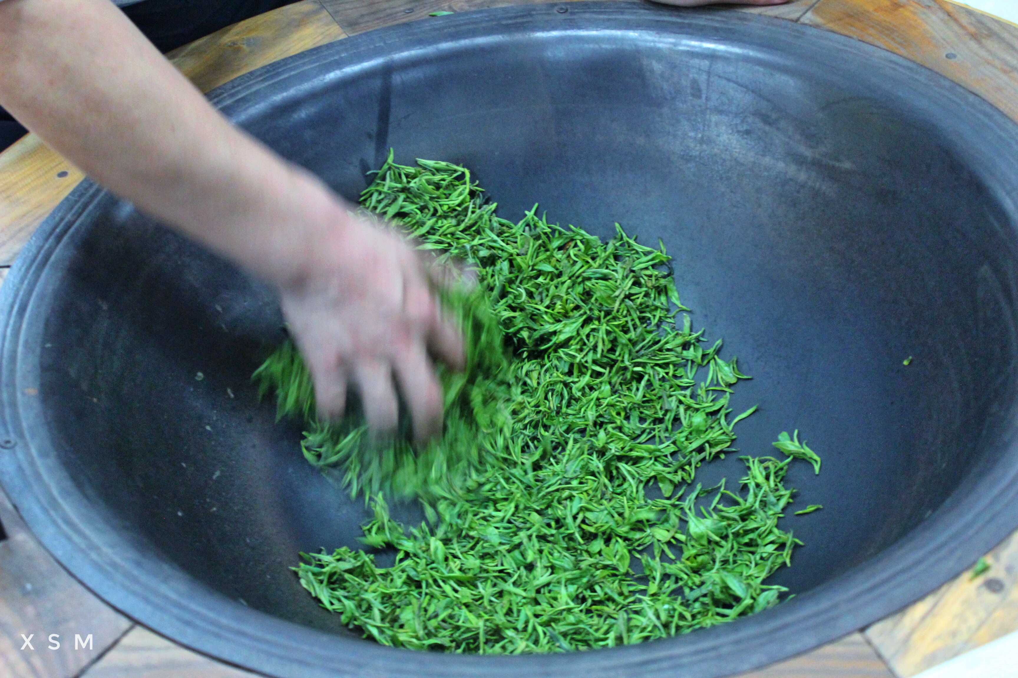 当地茶农概括为三句话:“第一锅满锅旋,第二锅带把劲,第三锅钻把子。”生锅主要起杀青作用,锅温180-200℃,投叶量0.25-0.5公斤,叶量多少视锅温和操作技术水平而定。炒法是用炒茶帚在锅中旋转炒拌,叶子跟着旋转翻动,均匀受热失水,要转得快,用力匀,结合抖散茶叶,时间约1-2分钟。待叶质柔软,叶色暗绿,即可扫入第二锅内。