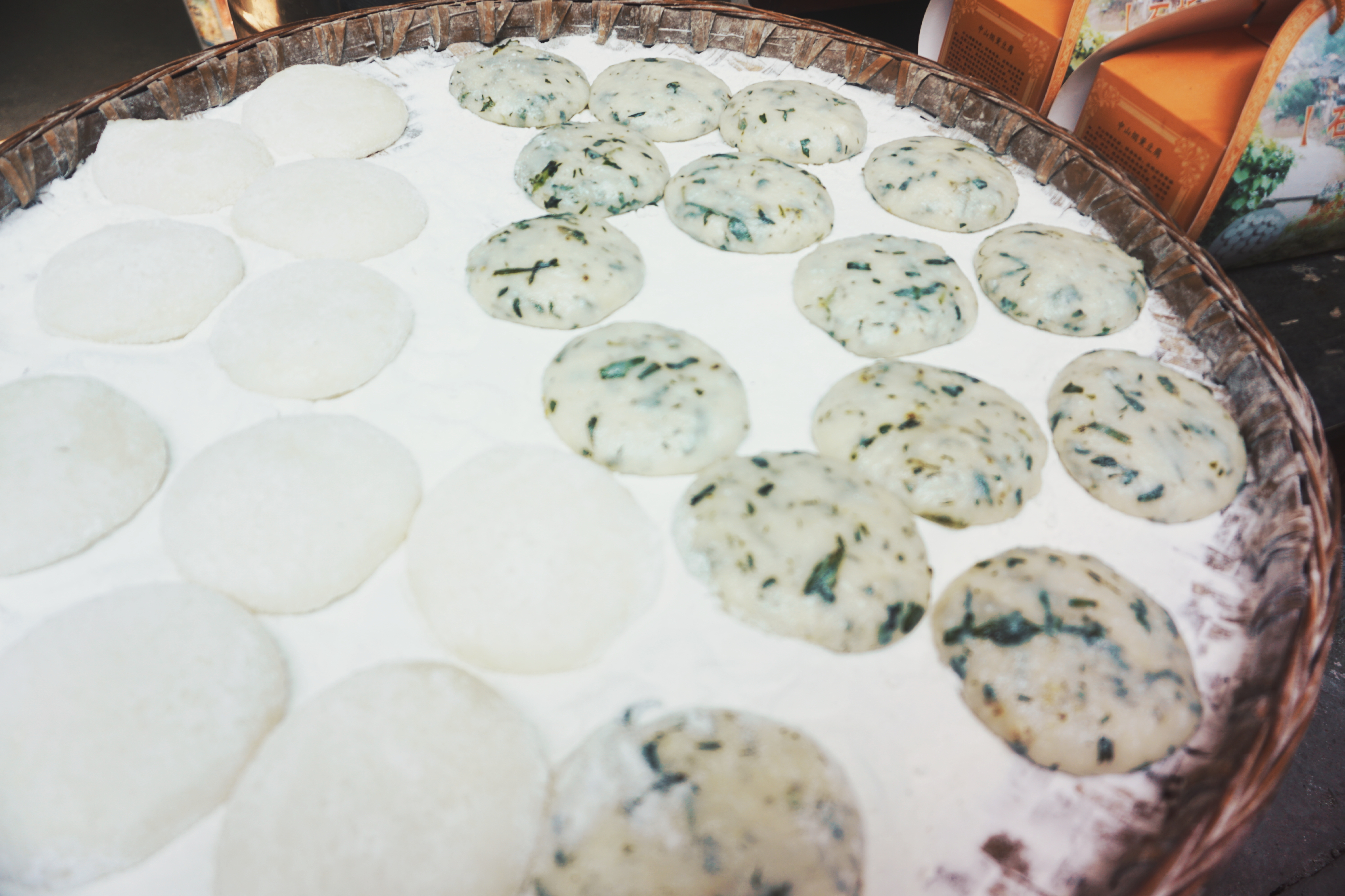 豆腐里面夹上榨菜、折耳根、一点点辣椒、小葱、香菜,嗯,吃了一个还想再来一个
