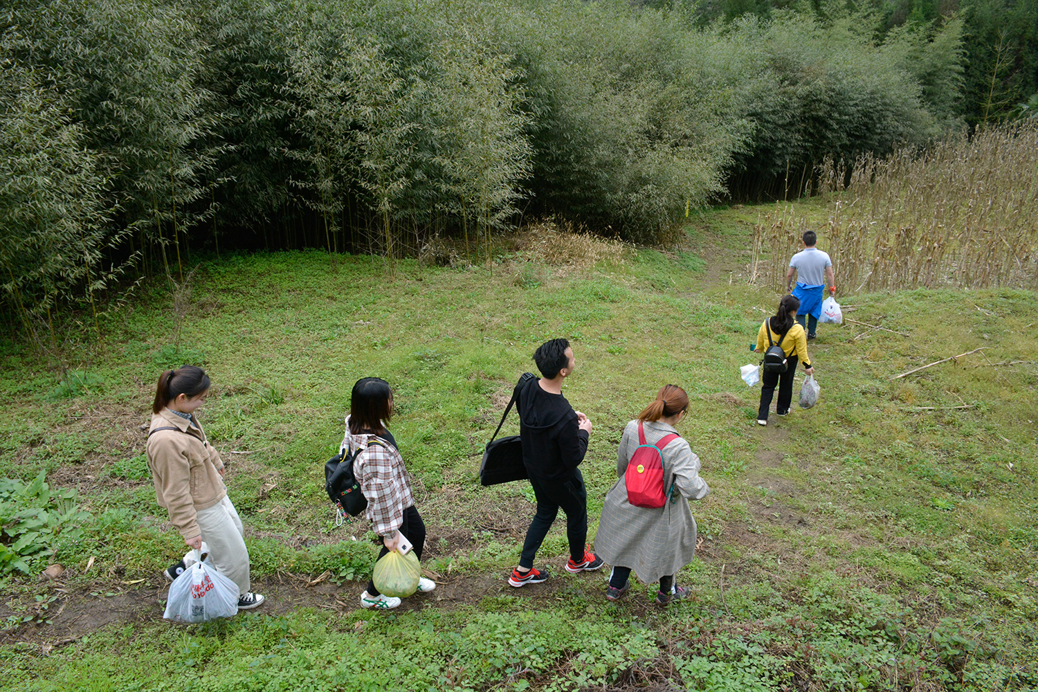 待人员集合完毕后,我们沿着岔路口向下徒行,前方是一栋偌大的木质房屋和一片茂密的竹林。