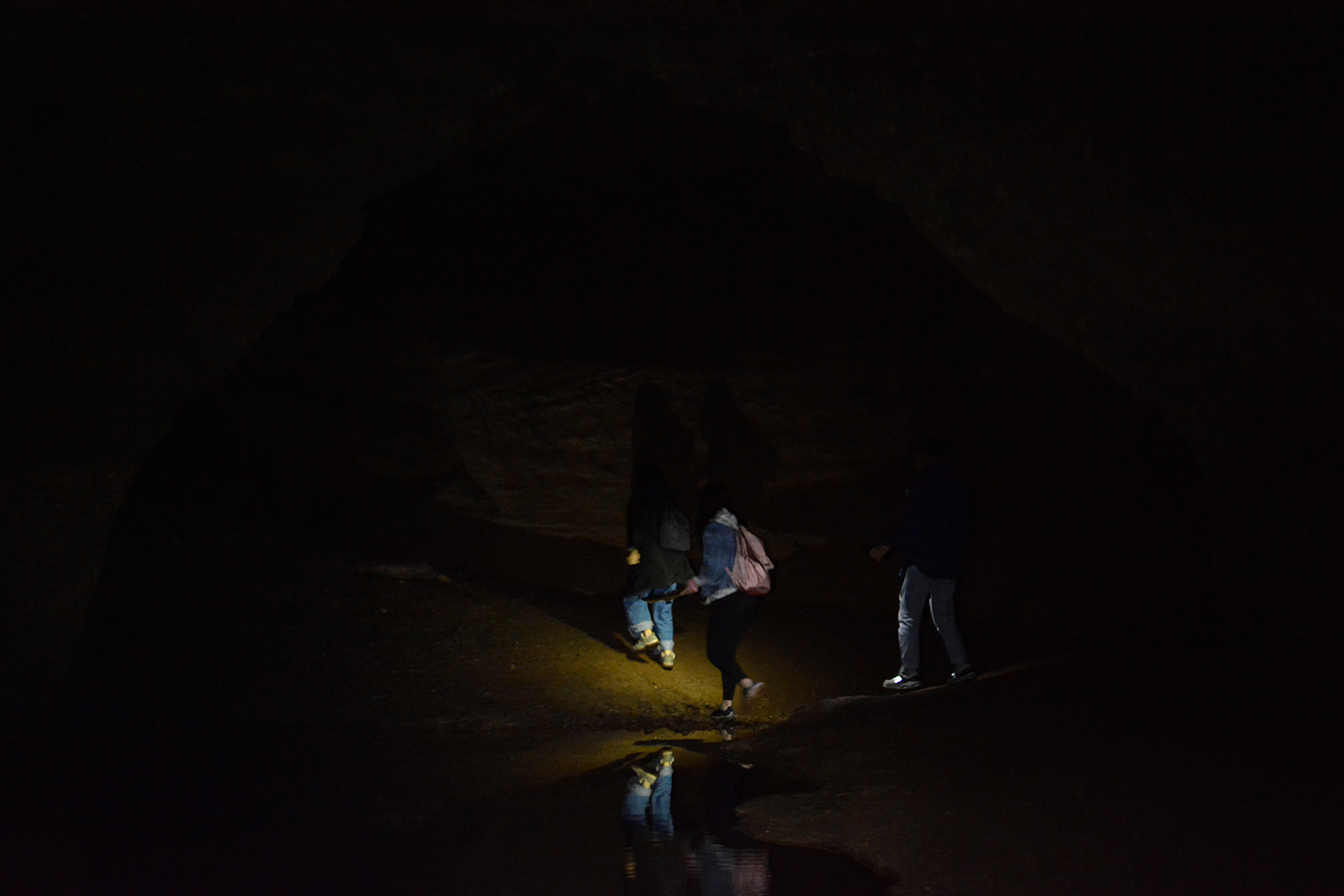 洞内灯光极暗,我们只能依靠手机光源才勉强照亮洞内的人和物。