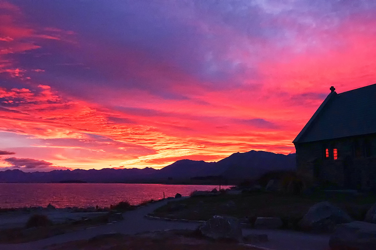 特卡波湖除了蓝天碧水群山之外,还有一处独特的人文景观,就是位于湖泊南岸的好牧羊人教堂(Church of Good Shepherd)。教堂是为纪念开拓 麦肯奇 家园的先驱们而设立的,建造于1935年。其设计和施工可谓匠心独具,墙壁全部由未经加工的大块岩石垒砌而成,简单而又古朴,室内面积不过二三十平方米,应该算是 新西兰 最袖珍的教堂了。由于具有纯净的山野风光和独特的教堂建筑,这里是各国旅行者必到的打卡点。