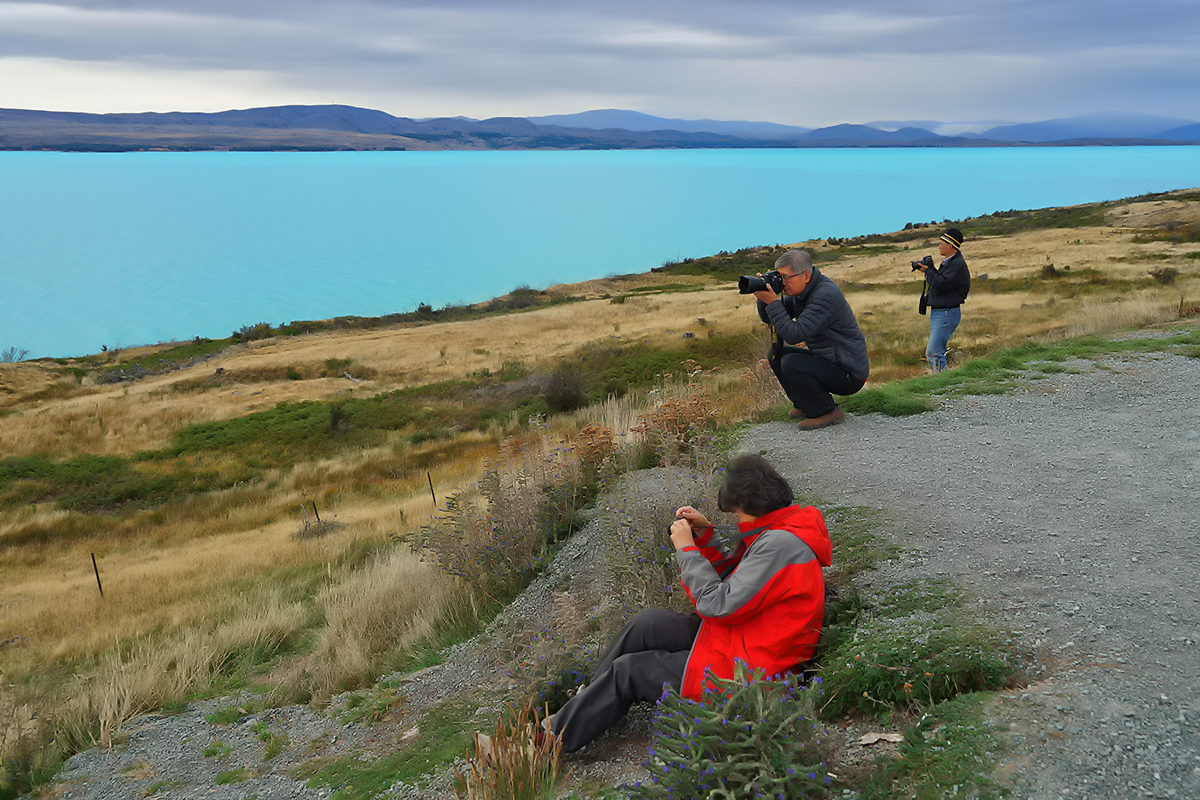 缓缓飘荡的云雾,给美丽的湖景又增添了仙境般的效果。我在想, 普卡基湖 就像是一个仙女沐浴的地方;而 库克山 就是一位天生丽质、冰清玉洁的仙女,正披着柔曼的轻纱,驾着祥云,款款地从缥缈的仙界降临。我凝视着湖面上泛着蓝光的云雾许久,等待着一窥仙女的美丽身姿,却始终未能见到她的真容。尽管如此,这幅美丽洁净的梦幻景致,让我们不禁彻底沉醉了。望着难以言传的震憾,我们都在惊叫:这里“帅呆了”“美惨了”“要死人啦”.......
