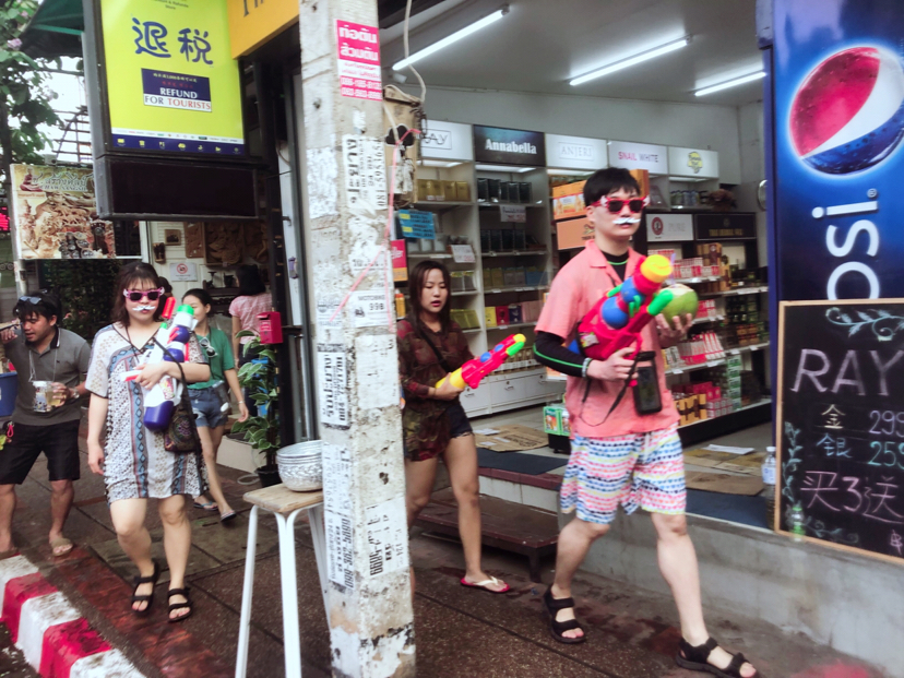 邻近傍晚,出发去宁曼路觅食。很意外的是,明天才开始泼水节,但是宁曼路今天就已经开始泼水了。完全没准备,身上很快开始湿漉漉了。躲进玛雅广场,遇到一位美女,也是被浇了一身水后买了全套装备。嗯回去后我也要采购一套同款。😄