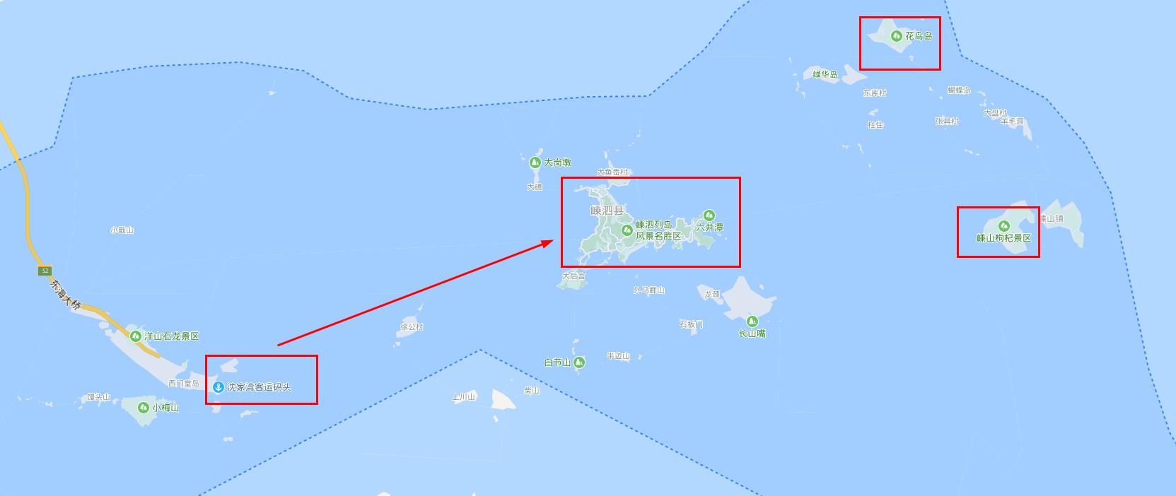 通过地图,可以很清楚地看到:往东还有花鸟岛和枸杞岛;往南还有东极岛。