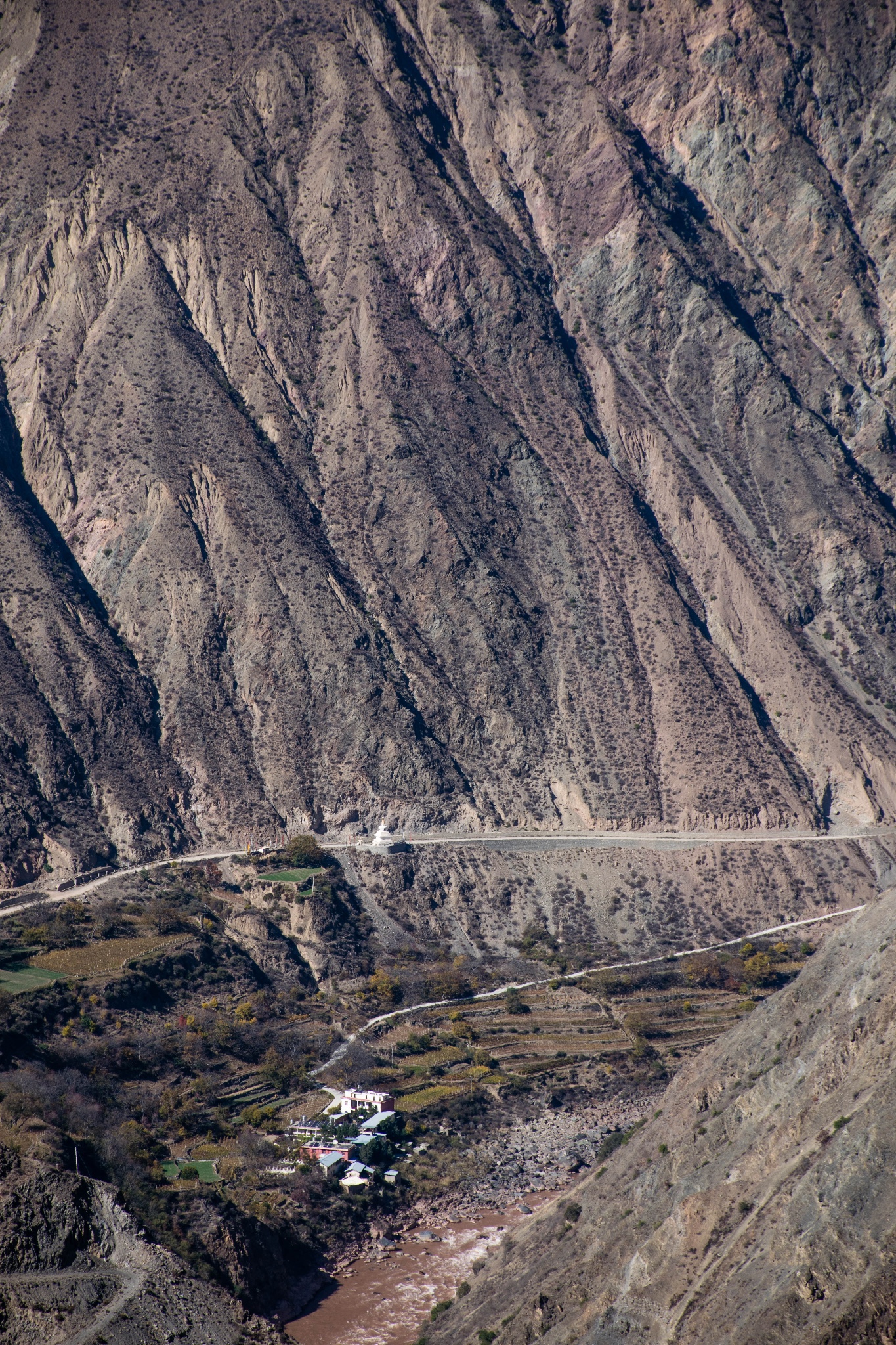 飞来寺 去往 明永冰川 的公路边,有一个观景平台,可以看到远处的卡瓦格博以及前 方山 脚下的村庄。