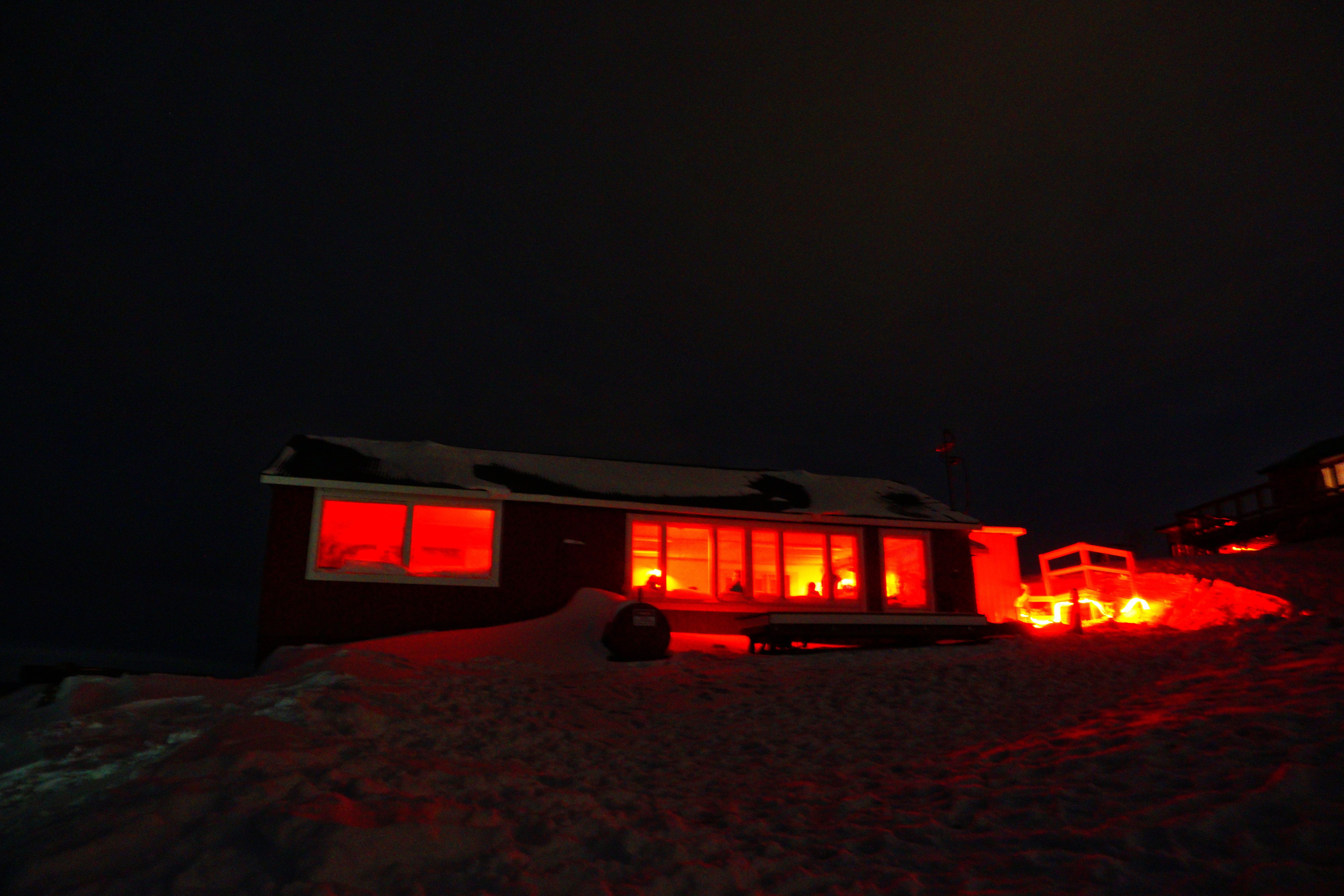 11月中旬的时候室内外温差不够大,出水时头发不能结冰,需要很久才能看到冰花。夜晚泡温泉,会与很迷幻的灯光。由于室外温度里,所以温泉的雾气很大,加上风向的影响,看不清楚天空。想看极光,可以在外面的空地上等待。