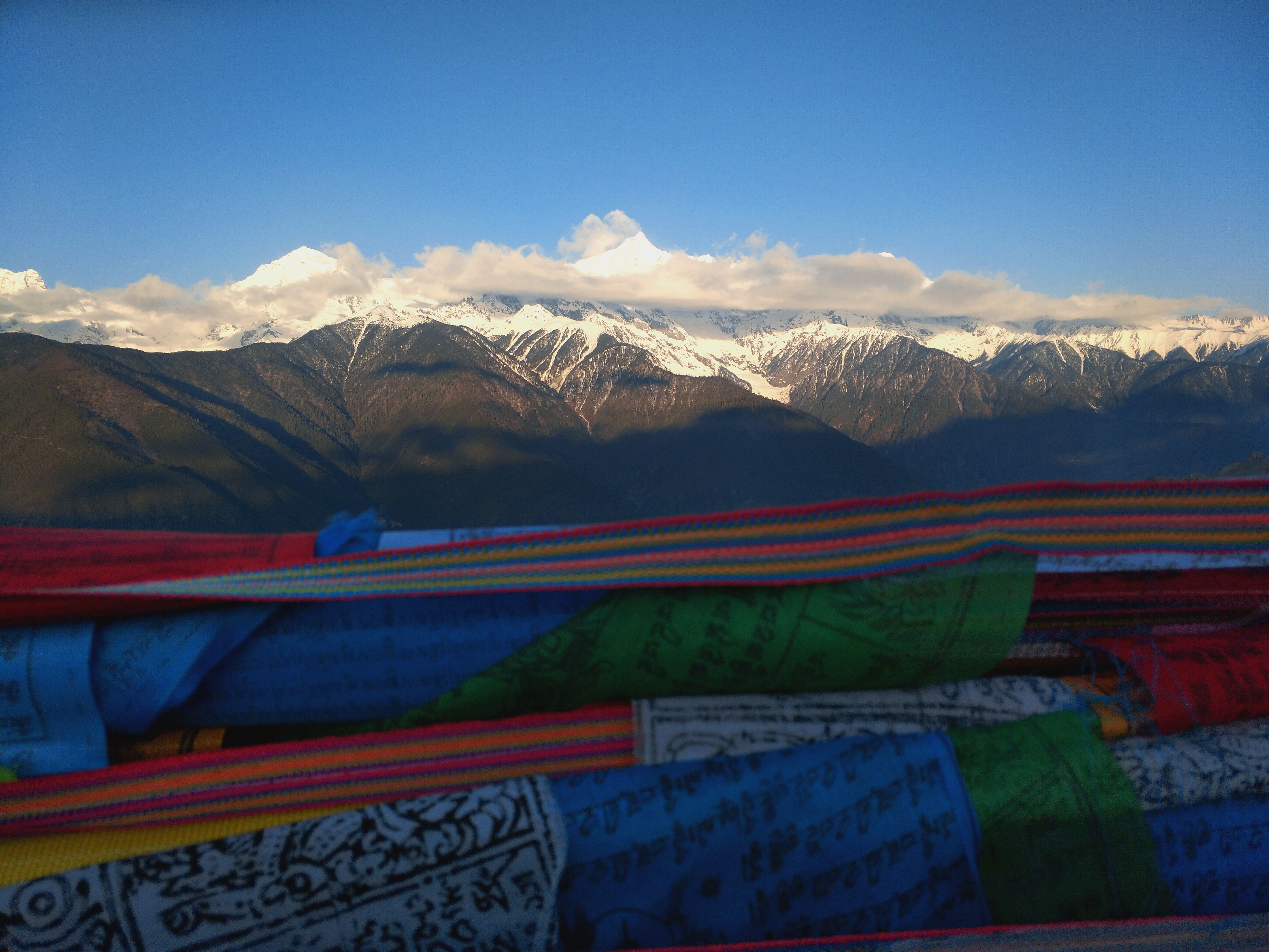 睛天,蓝天碧空,梅里十三峰耸立在眼前,太阳从山背后渐渐沉去…祈祷明天依然晴天,日照金山!