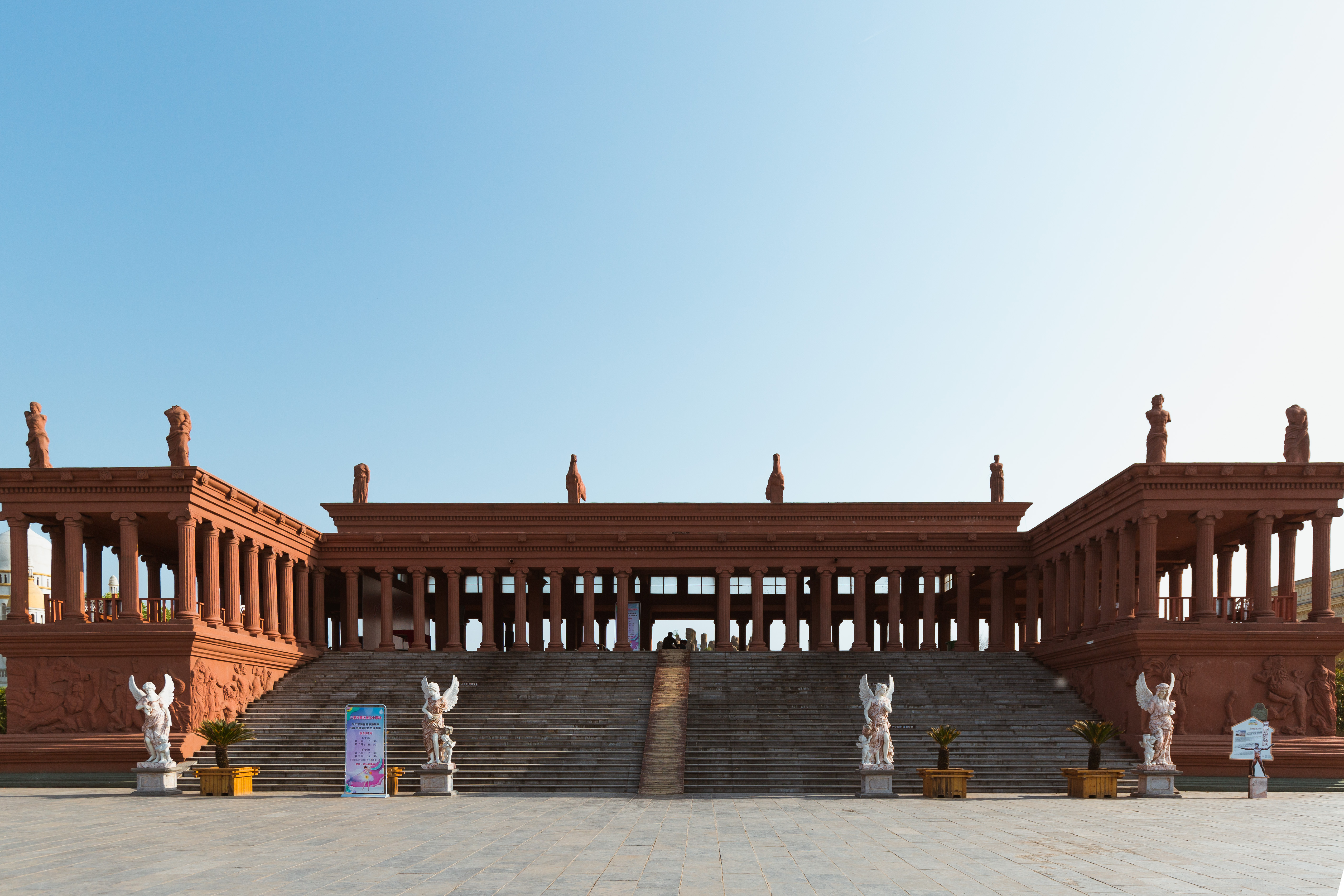 眼前是一座 希腊 的宙斯神庙,朱红色的宫殿建筑庄重大气,漫步走 上高 高的台阶,透过红色的柱子眼前一亮看到了 美国 的大峡谷风光。