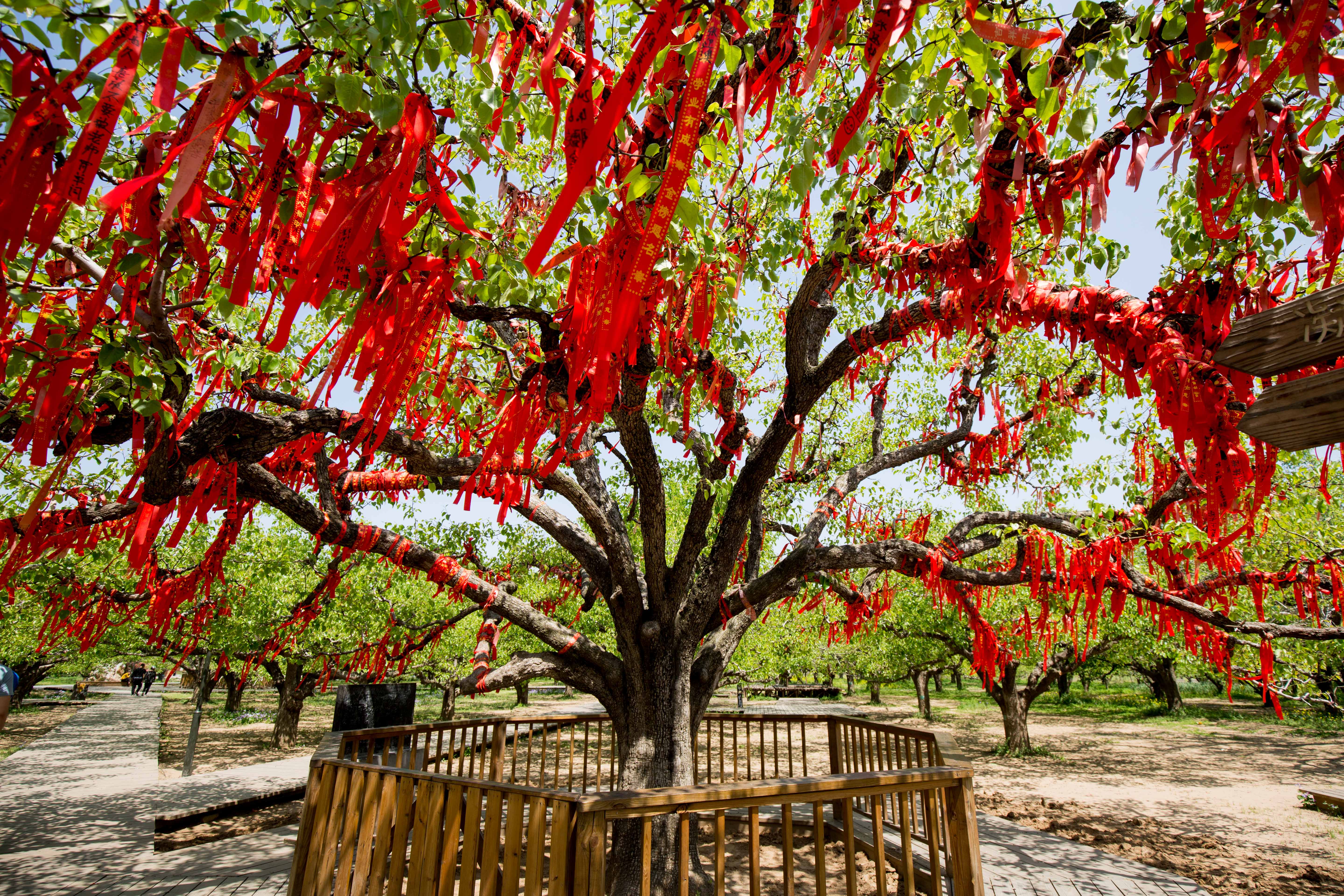 和 梨树 王呈现的景色不同, 梨树 神的枝条上挂满许愿带。放眼望去,整株古树被红色所包围。许愿带随风飘舞,甚是壮观。