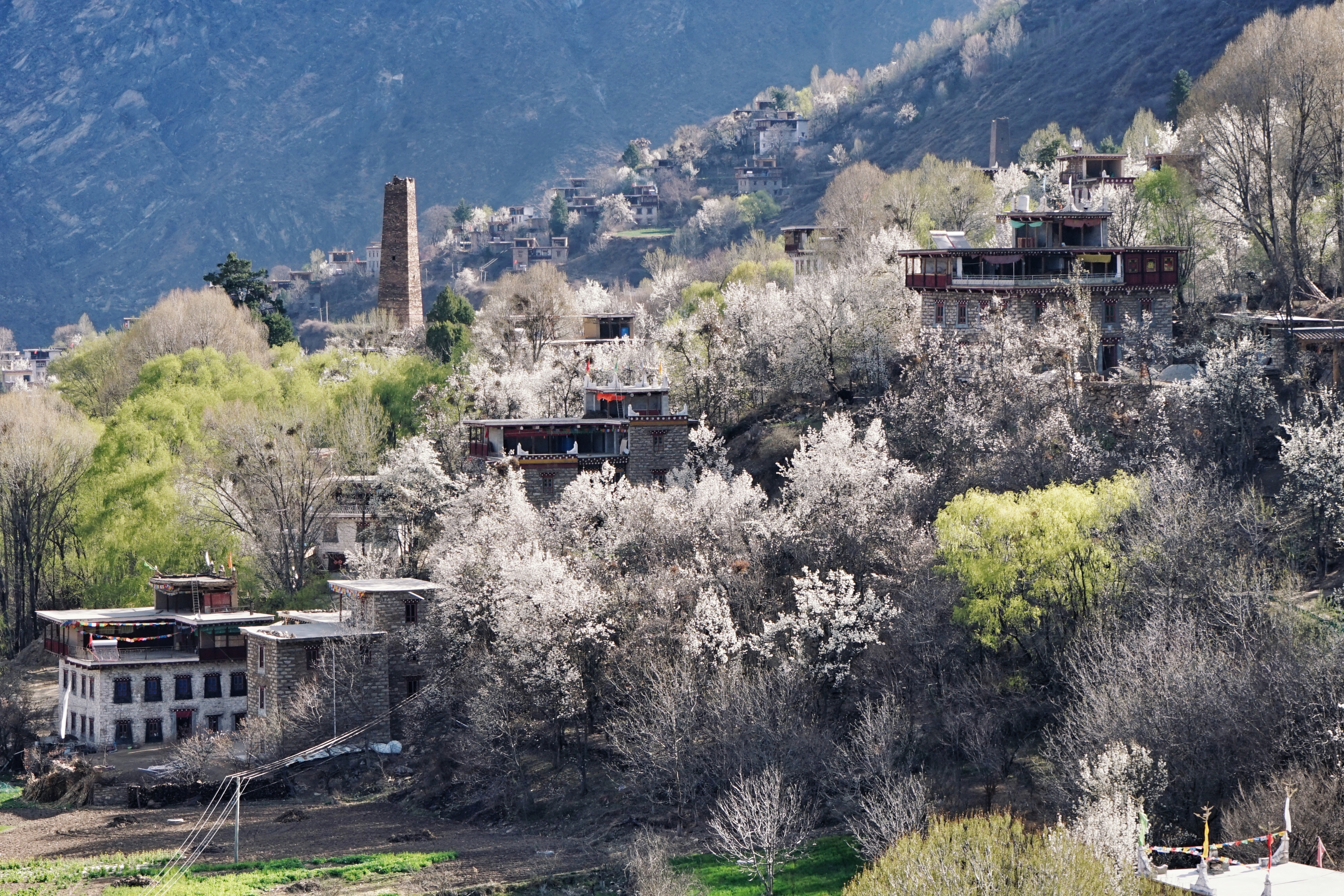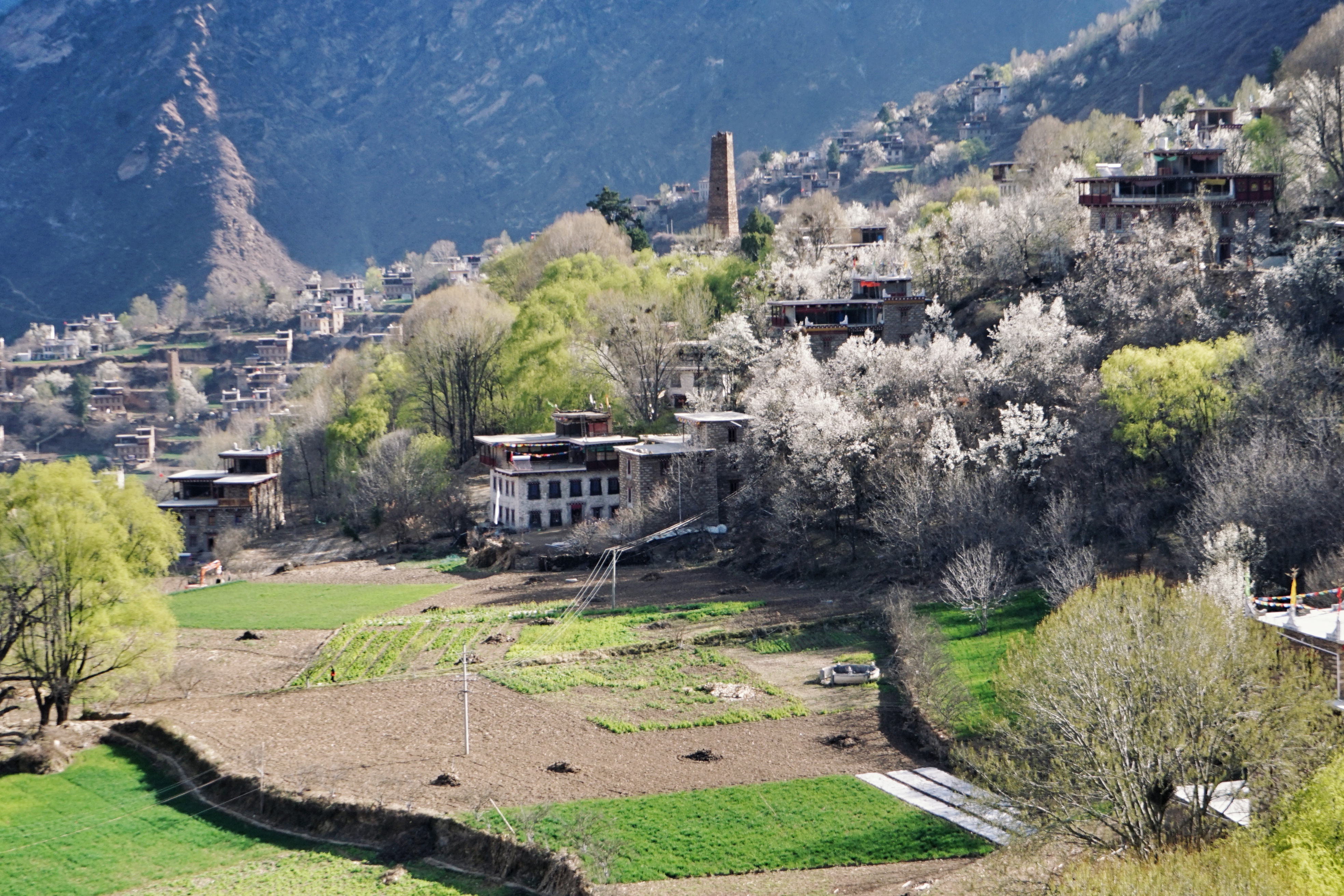 默默思考了一下,藏寨、梨花、柳树、碉楼、规整的田地和蜿蜒的小路……搭配起来刚刚好,缺一项,都构不成这样美丽的场景,尤其表扬嘉绒藏族同胞们的勤劳以及对土地的珍惜,整个村子的田地都被打理的井井有条,无一处杂乱。