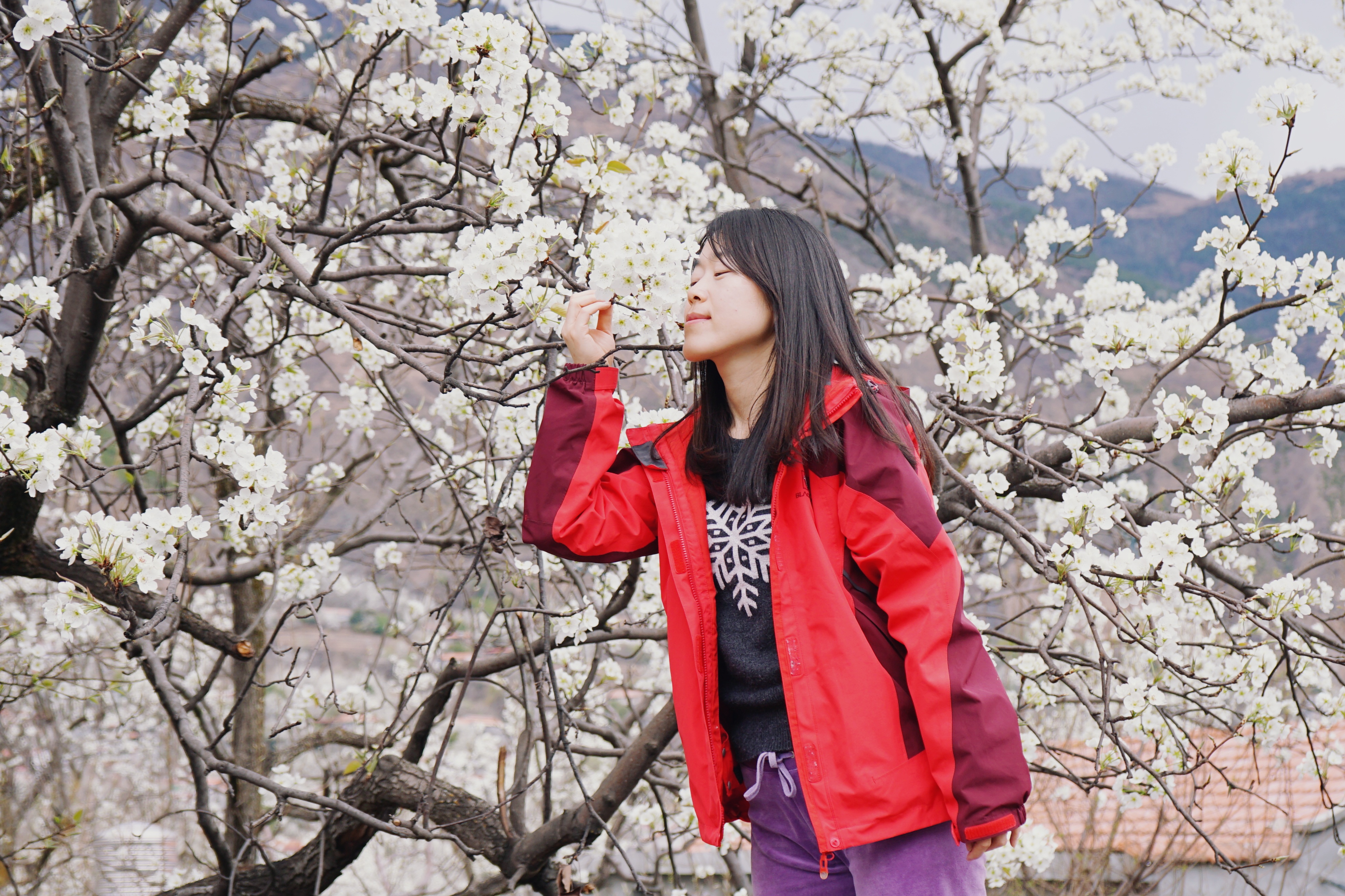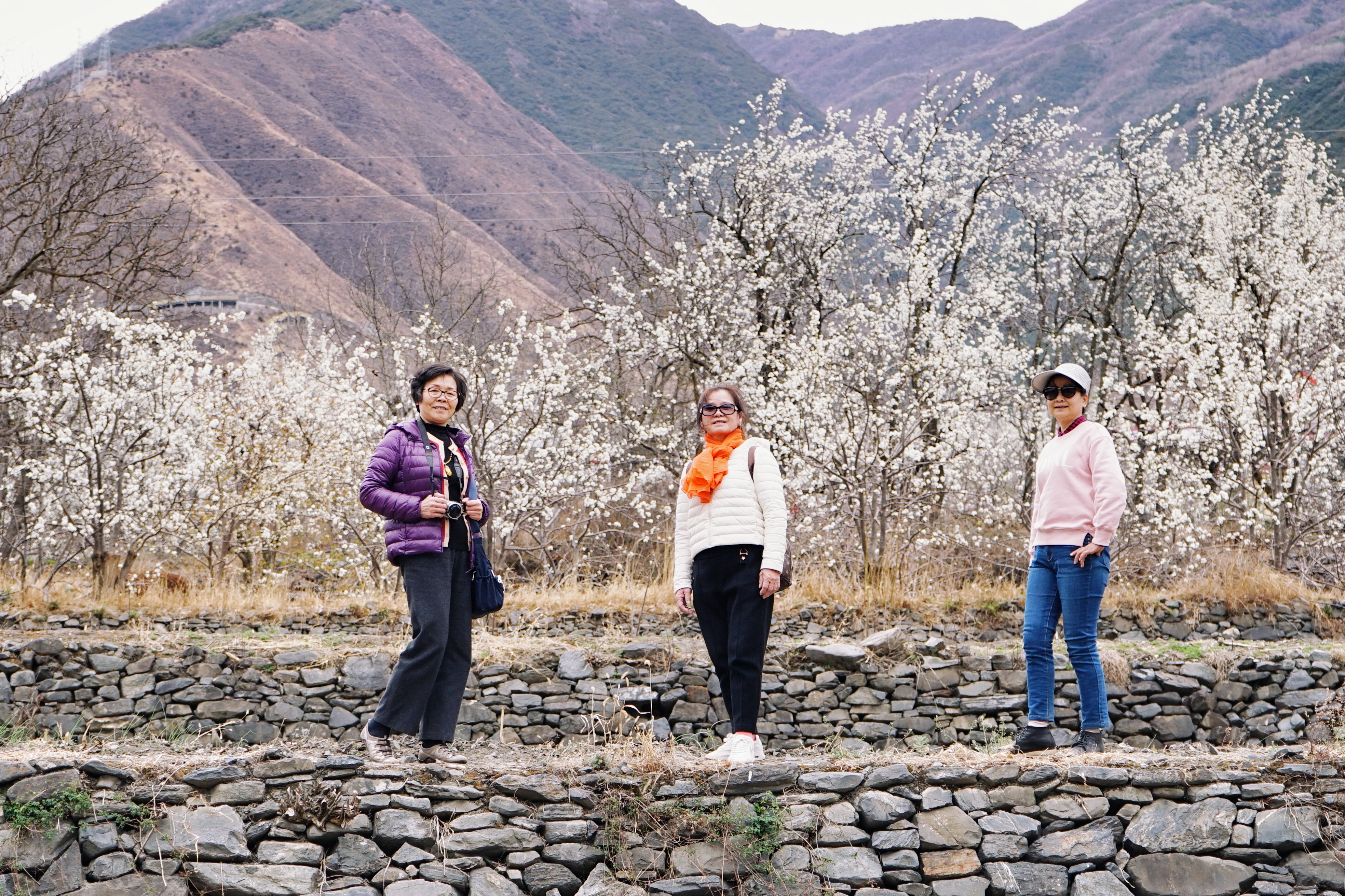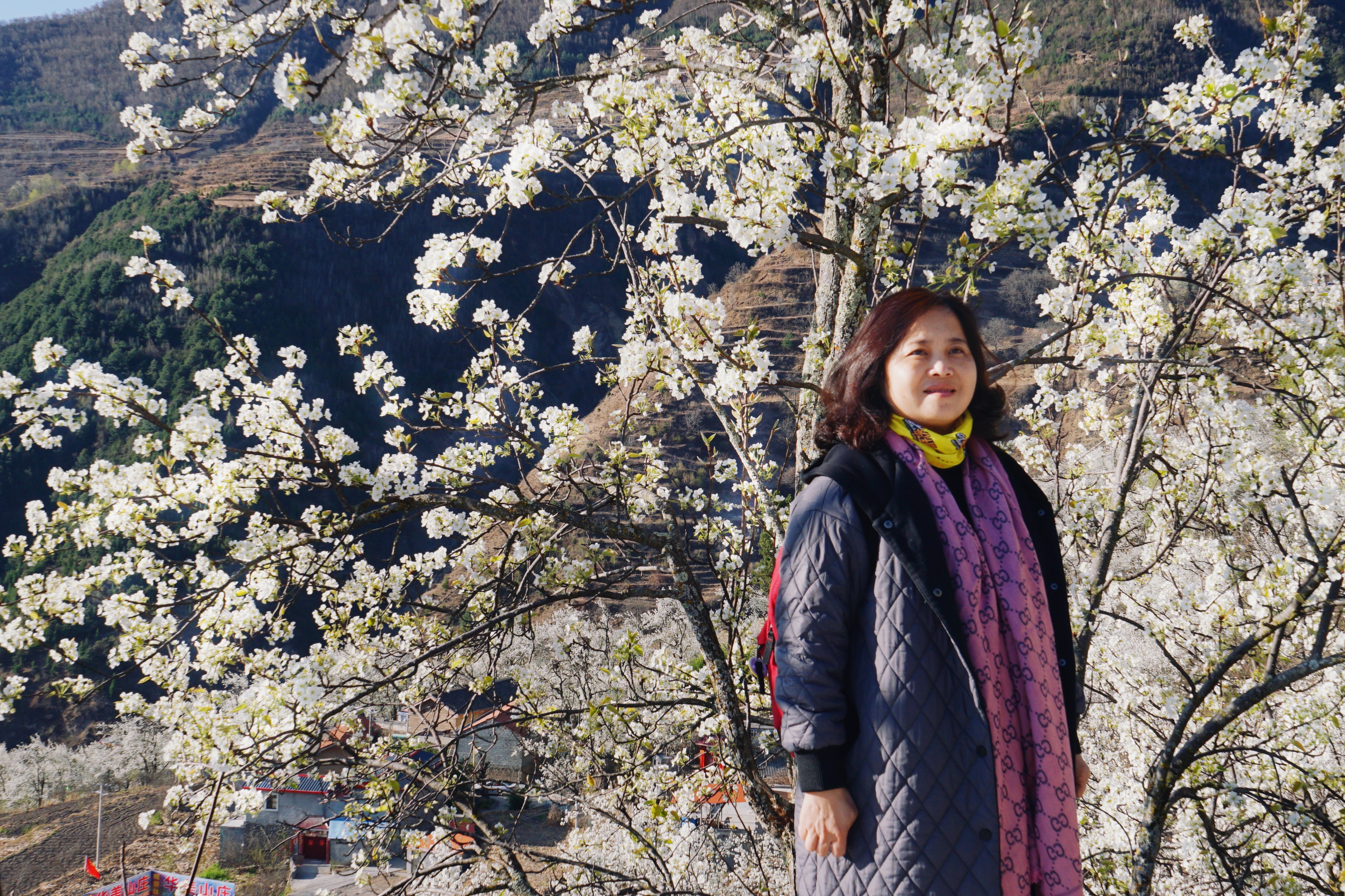 下午到达金川县城旁边的沙尔乡,满山都是梨花树,但可惜下午太阳被云遮住了,起了微凉的风,花花看着没有往日精神。