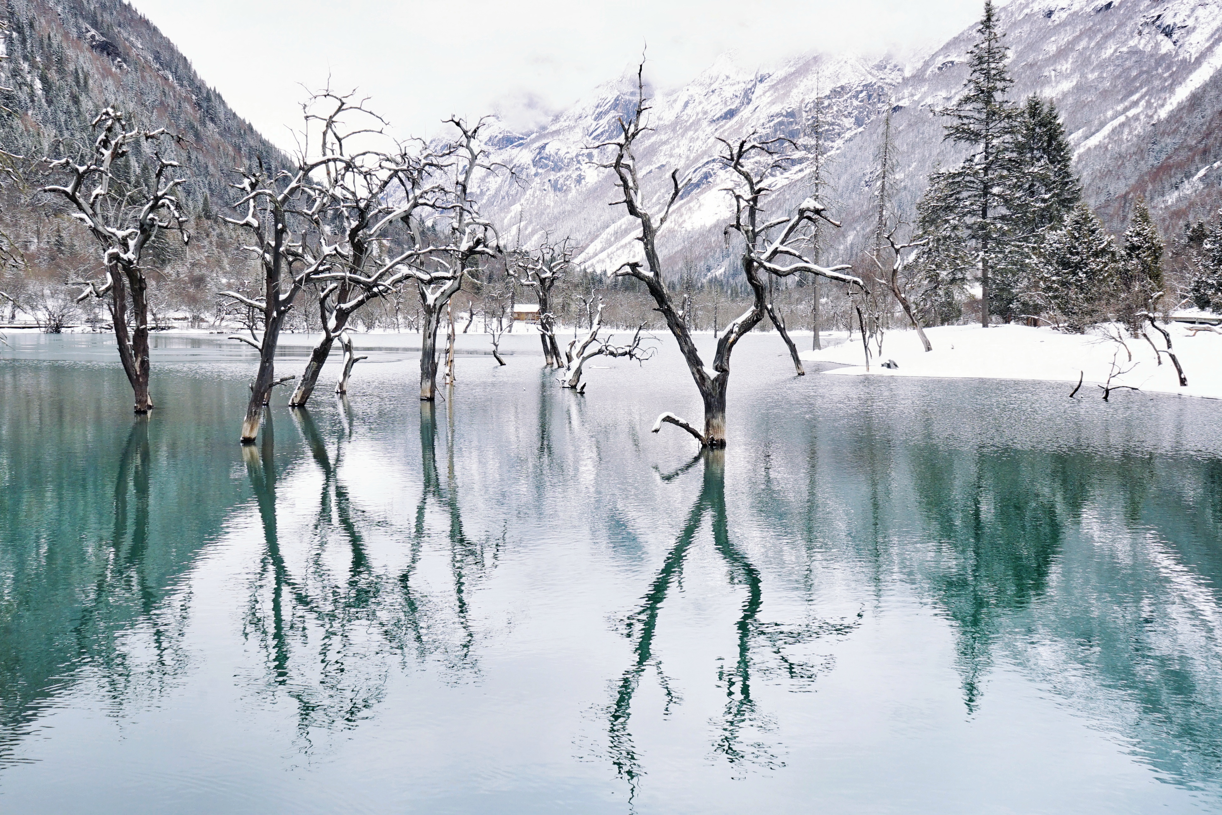 张牙舞爪的树木屹立在寒冰和春日交替的水中,隐隐窥见山体的倒影,不复之前全然结冰的样子。