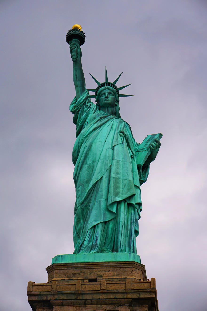 自由女神像是美国国家级纪念碑,矗立在哈德逊河口的自由岛上,头戴光芒四射的冠冕,高举自由火炬,手捧《独立宣言》,宏伟瞩目。女神全名为自由照耀世界之神,是美国的象征。是1876年法国赠送给美国独立100周年的礼物, 自由女神像内部中空,可搭电梯直达神像头部,底座是美国移民史博物馆,记录着数百万移民漂洋过海来到美国的历史。