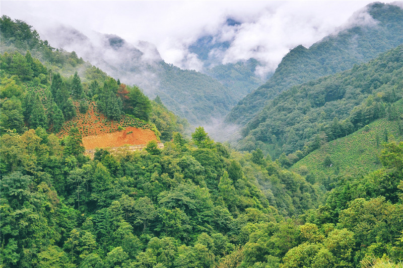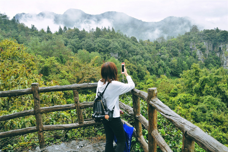沿着斑驳的石级,在巨石之间迂回穿行,突兀欲坠的山石紧悬头顶,令人心有余悸,苍绿参天的古木环绕身边,使人抒发幽思。天气渐渐阴暗了下来,低云在山间萦绕,缥缈幻移,宛如仙境。湿凉的空气,通透清新,沁人心脾。沐浴在山间清冽的气韵里,漂游的薄雾从耳畔缓缓流过,带走了现代城市里的喧嚣,吸纳着从草尖露珠上滑动着的气息,吐出了办公桌上堆积的烦尘。这是放飞心情,清心润肺的历程。