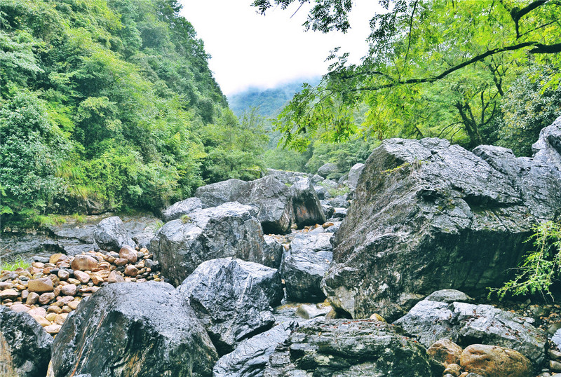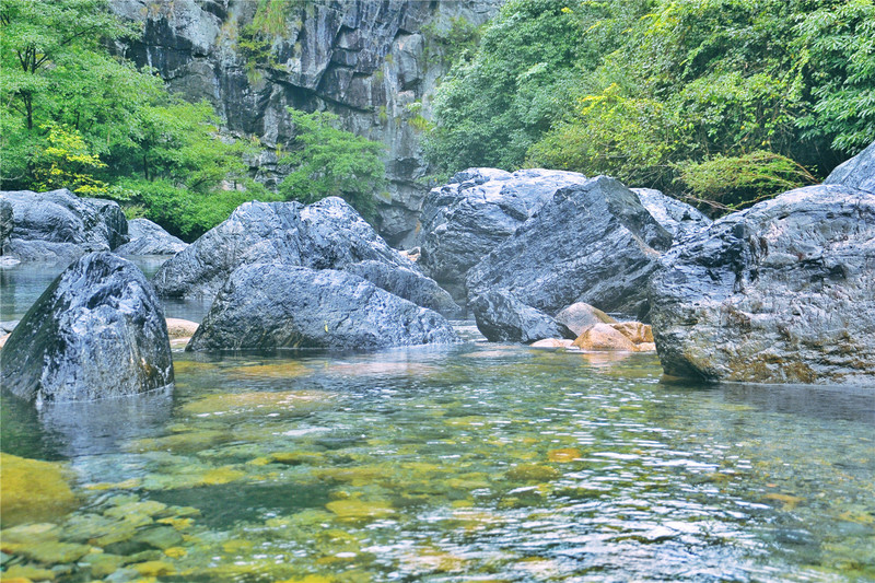 汽车从池州出发过石台县城,经过一段曲折盘旋的环山公路之后,静谧俊秀的石台牯牛降自然保护区就出现在了眼前。龙门景区是游客进入牯牛降的第一站,在游客服务中心乘坐景交车进入景区,见两股从山涧奔流而出的溪流汇合在了一起,形成了一条清澈见底的河流,这就是剡溪河。蜿蜒而来的两股溪流,把龙门景区分成两个部分:龙门潭和严家古村。