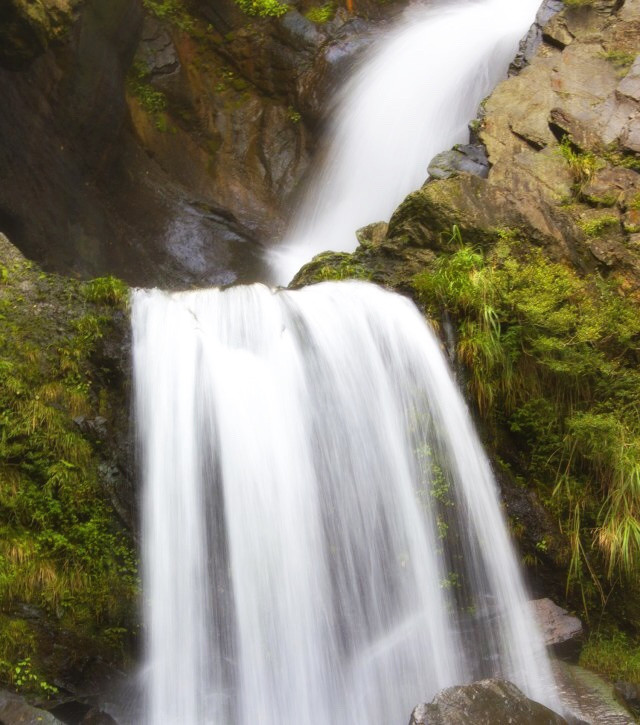 下山途中,峰回路转,我们的眼前突然呈现出一幅悍然心魄的巨幅瀑布,在山崖峡谷间形成四层交叠的奇特景观,落差感觉有20多层楼高,这就是著名的四叠瀑了。银白色的山泉从奇峰间倾泻而下,湍急的水流声仿佛天空中轰然滚动的雷声,气势磅礴,蔚为壮观。水流层层跌落,时而交汇,时而分开,溅起的水珠,云雾茫茫,就像是晴空里的细雨,散成轻绡,飘飘洒洒,直入深潭,水流边绿树掩映,奇花异草,加上古松和奇石,把整个瀑布映衬得格外亮丽鲜活,构成了一幅景象万千的天然画卷。