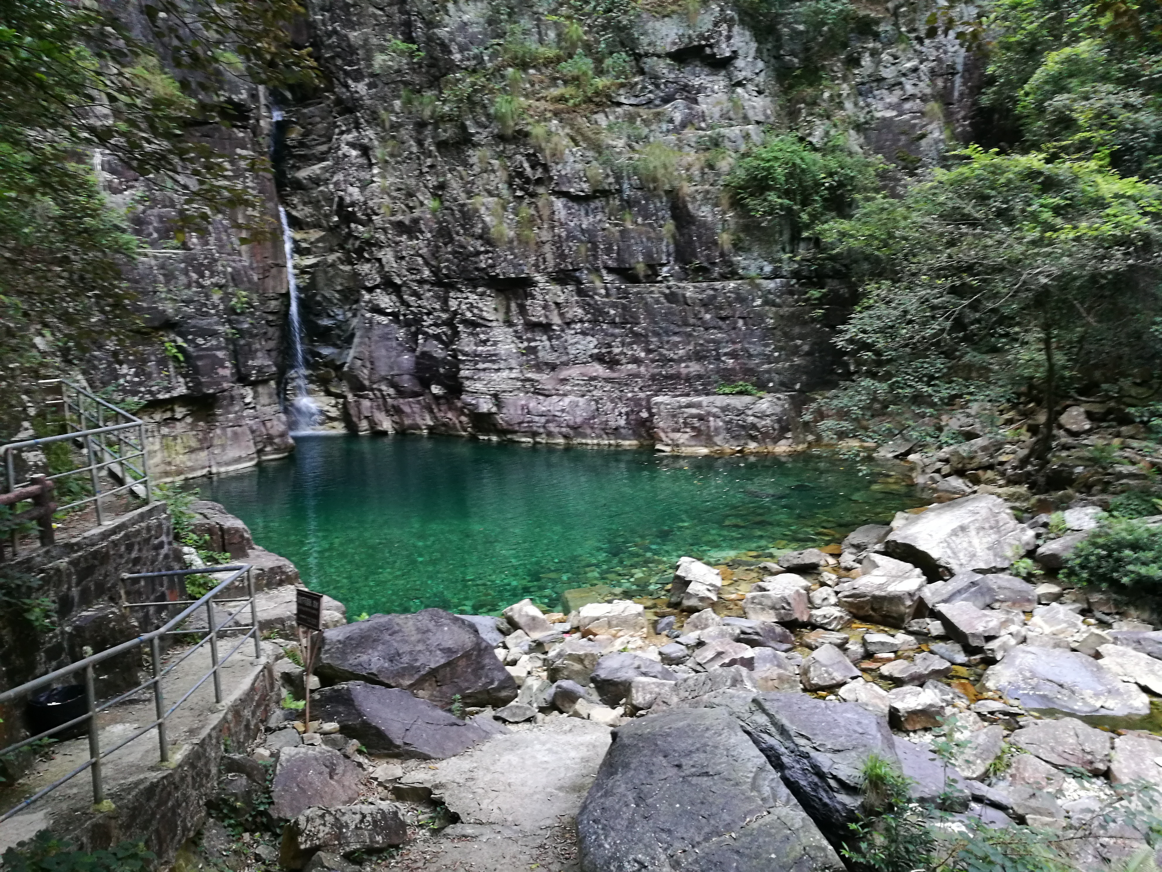 下到接近谷底的地方,我们走到最深处的地方发现了这个如同九寨沟一样颜色的一个小水潭