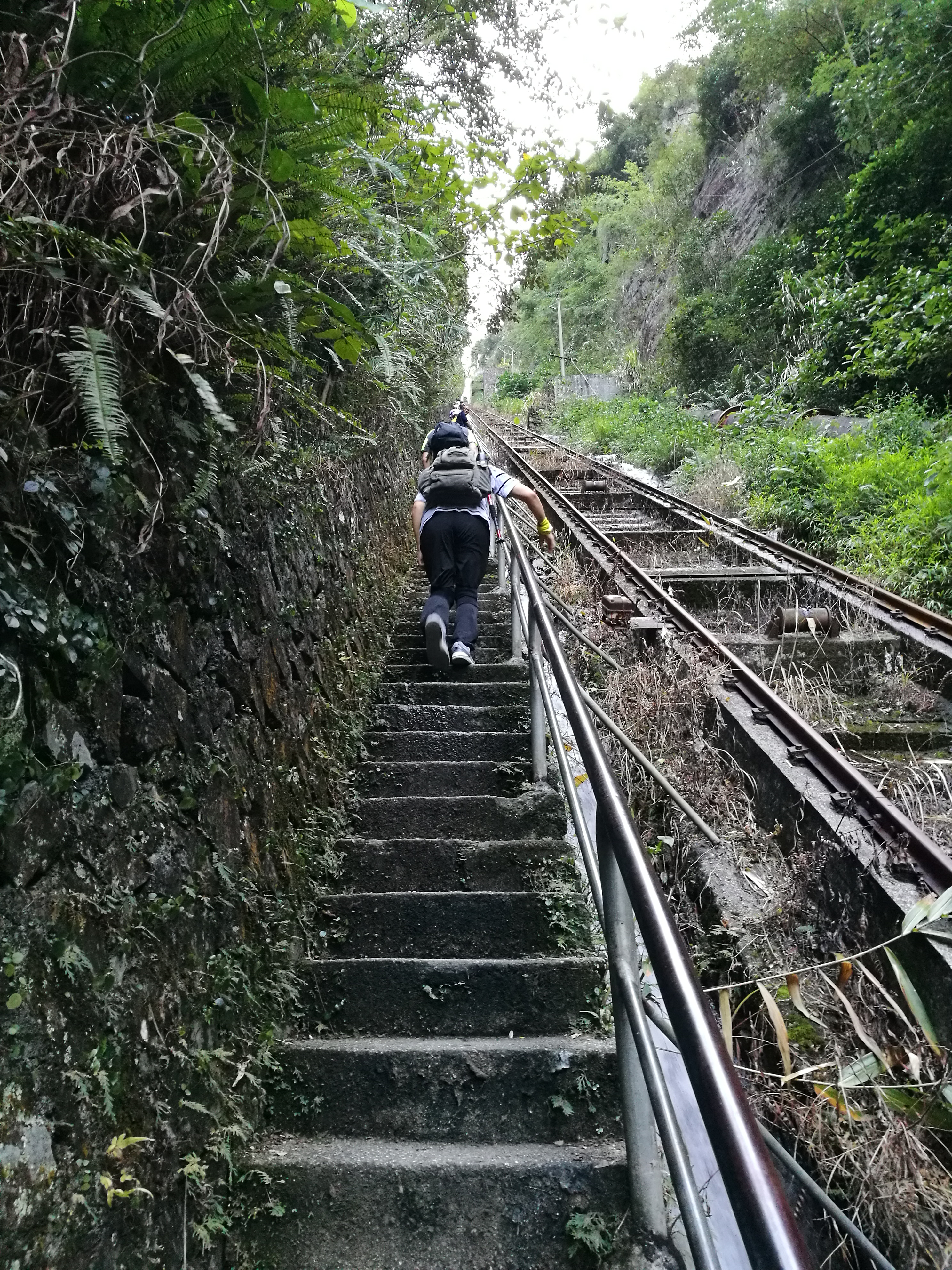 转了一个山弯,天梯突然就出现在眼前,众人欢呼!这是一条坡度达50度斜角的有着1386级石阶的“通天梯”