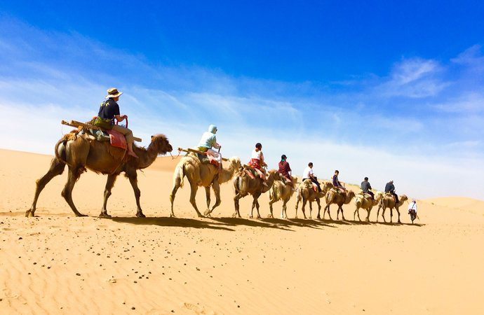 下午的行程也很有意思。骑着骆驼漫步茫茫沙海,骆驼很温顺,一个口哨声之后,骆驼队就出发啦!在摇曳不定的骆驼背上起起伏伏,头顶是辽阔的蓝天白云,脚下是广袤无垠的沙漠。让人突然想起了《沙漠骆驼》这首歌,“我要穿越这片沙漠,寻找真正的自我……”嗯,这感觉真是妙哉!