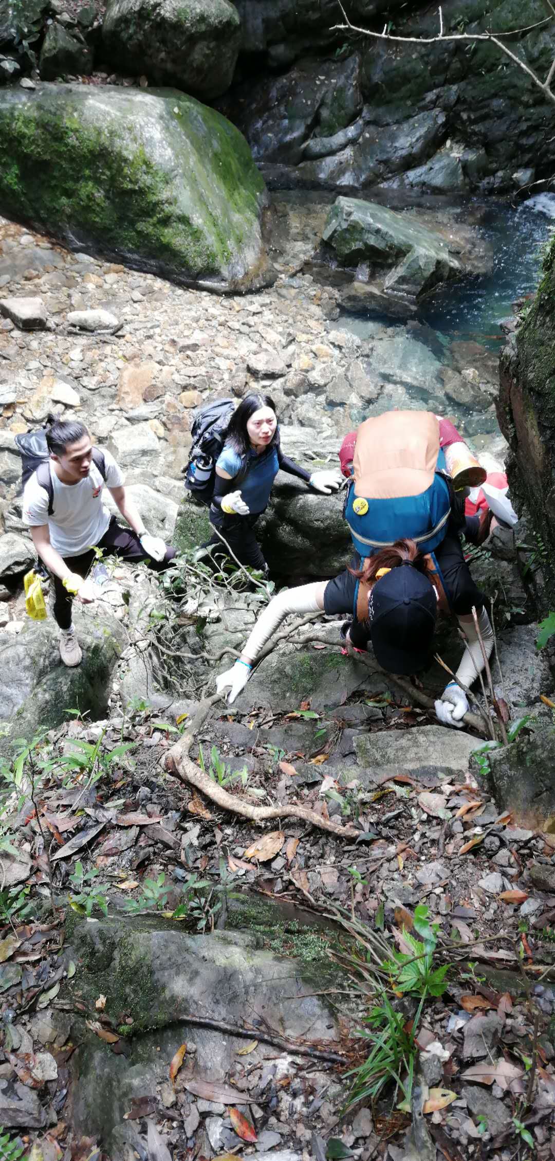 沿着小溪一直往上,鞋子一定要足够的防滑。水流的声音很大,证明落差很大,我们是真的在爬升了。