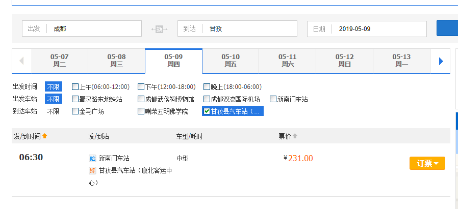 可前往新南门车站购买车票,每天的出发时间是早上6:30,携程去哪儿等平台就可以购买车票,票价231,顺利的话一共要开12个小时,预计下午19:00左右到达
