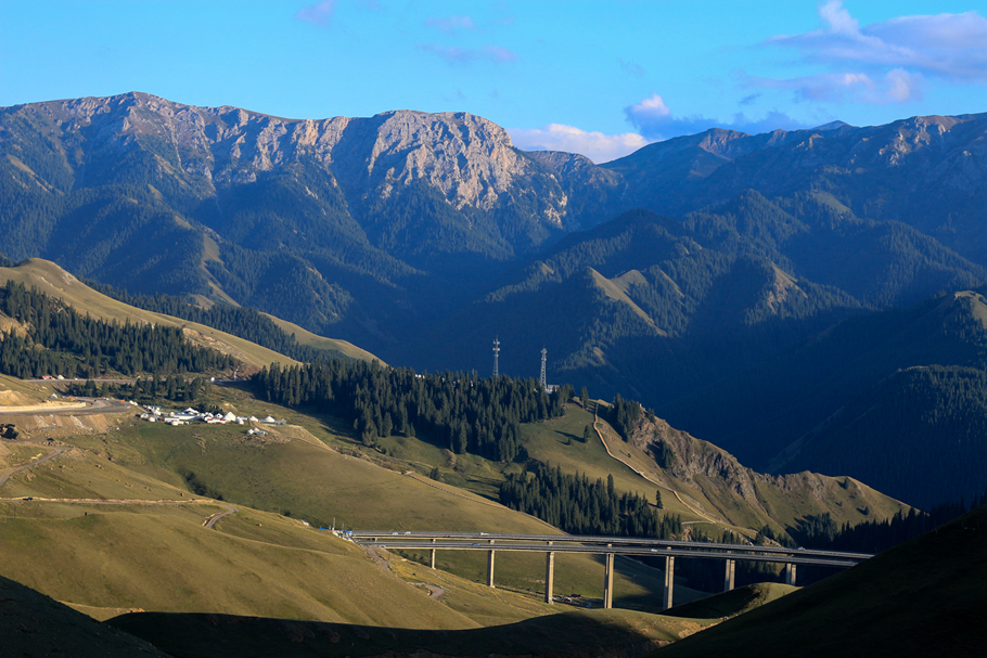 伊昭公路是古丝绸之路还很险峻的一段,虽然现在是柏油路也不能太大意,非常多的弯道,盘山路让悬崖不停地出现在眼前。在这条路上行走,有高山、有草甸,也有杉林、有雪峰,满眼尽是大美景色。