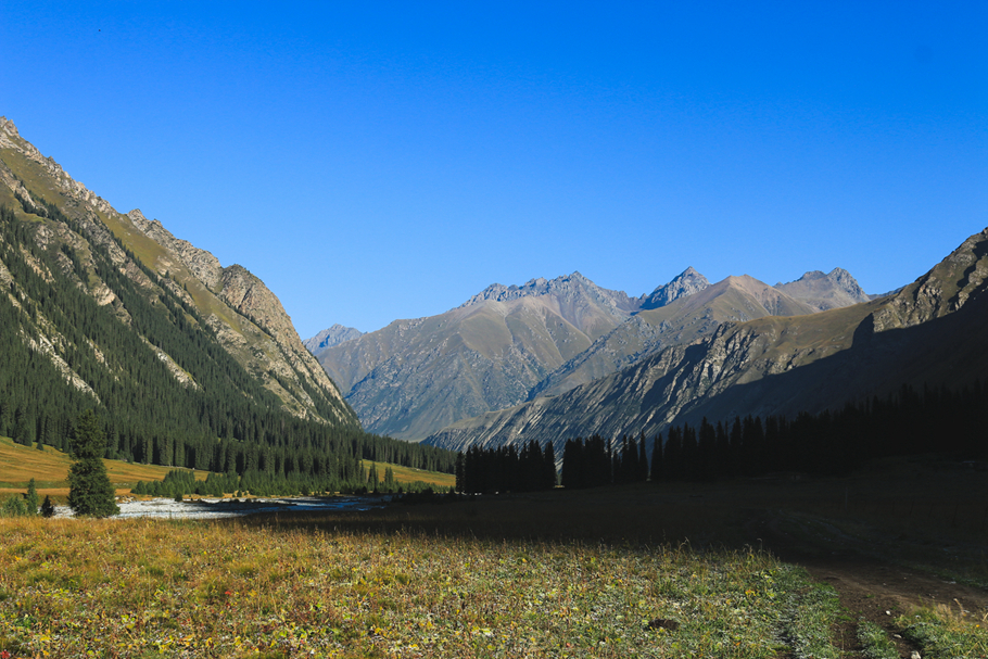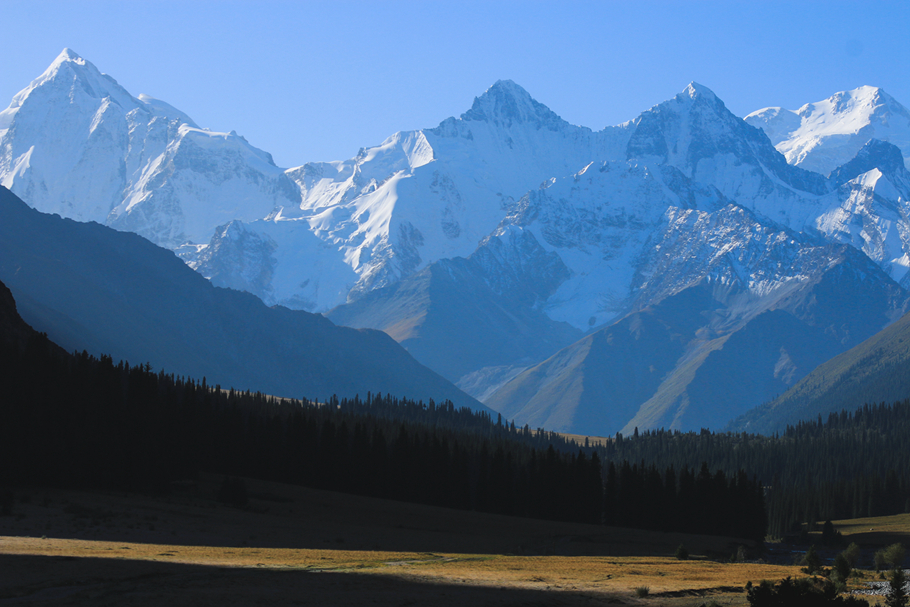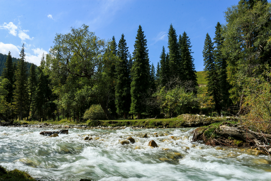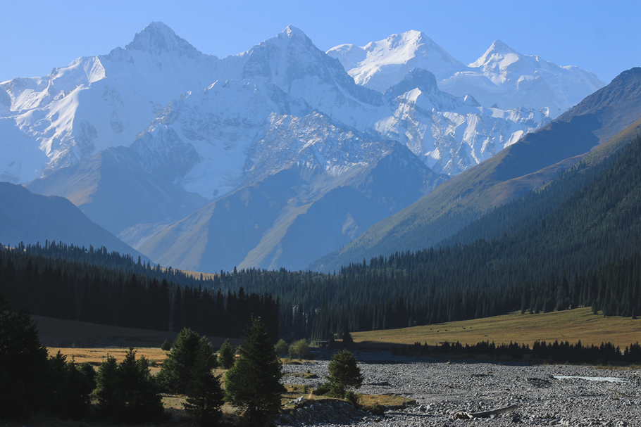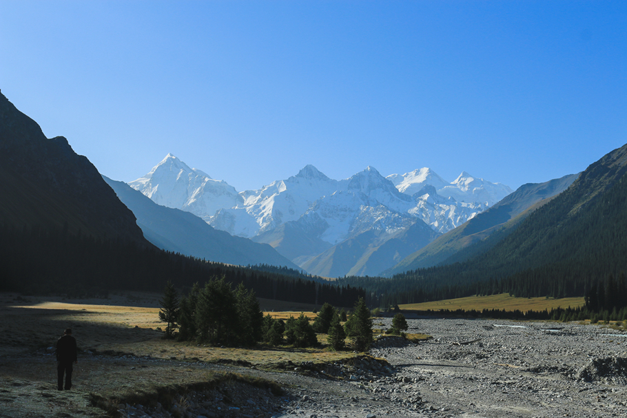倒是很迷恋荒郊野岭的徒步路线,风光通常十分旖旎,令人向往。特别是在这,广阔的场景让人心旷神怡,独具魅力的原始森林,天山之父汗腾格里峰一直出现在眼前,眼光实在不舍得离开这一片雪山。