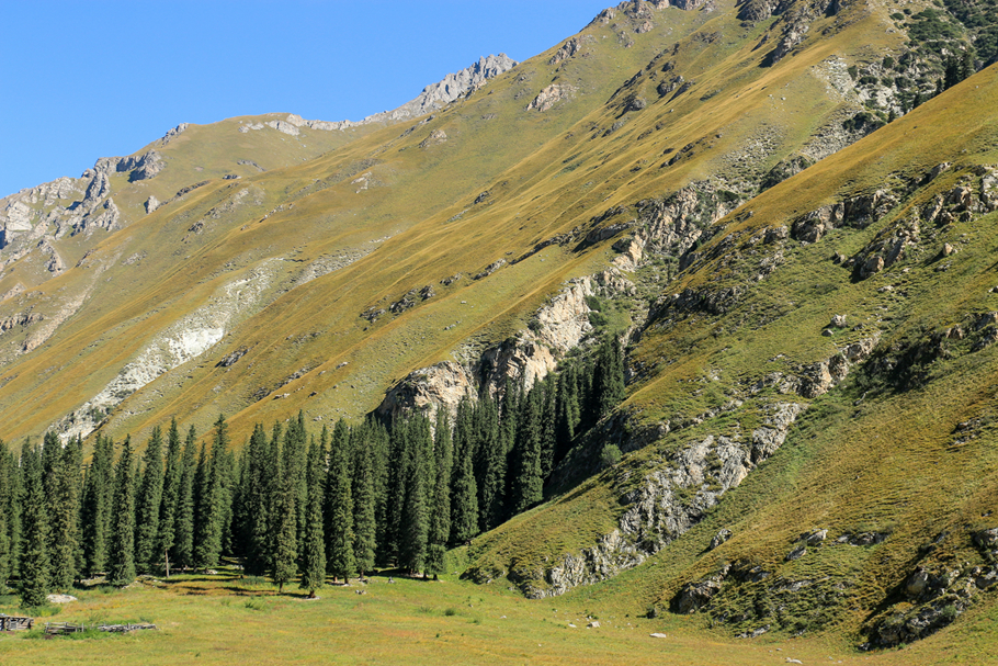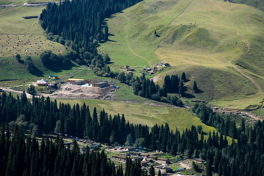 琼库什台是我在疆一月最喜欢的一个地方,这里简直就是桃花源,进入琼库什台的山路有一大片“人体草原”,可更吸引我的是村子里的小木屋与山上墨绿色的杉林、青黄不接的草原所配合出来的那幅画面。