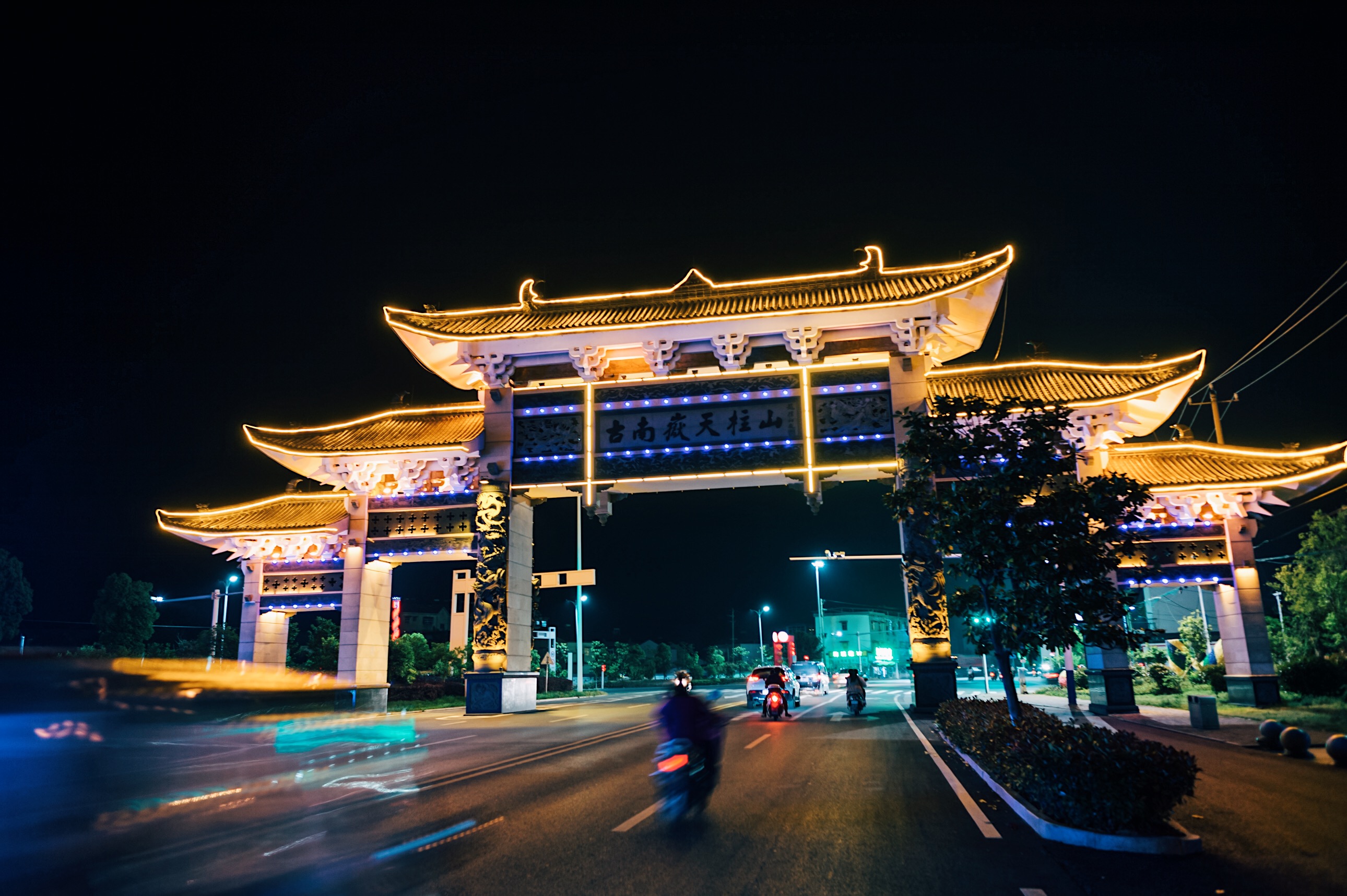 二乔公园与以往游览过的公园没有太大的区别又似乎有着很多的不同,这类确实如很多人说的那样,二乔公园真的如“二乔”一样的美,入口处简介的牌坊,三国的建筑倒映在水中尽显的很是柔美,特别是在夜景。曲桥横跨于水面之上,仿佛这就是那条穿越的时光轨道。百看不厌的白墙灰瓦,亭台楼阁轩榭廊,在夜色和灯光的衬托下彰显的更加的古色古香。