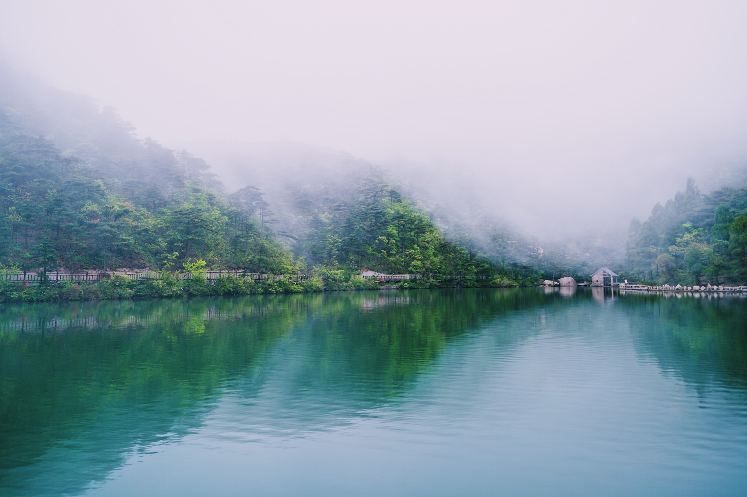 如果到了炼丹湖不感受一下潜阳十景之一“丹灶苍烟”的盛景是件很不完美的事情,这种盛景大多会出现在雨后初晴或者阴雨天,很庆幸我这次见到了这一仙境。云雾时而袅袅上升,时而就地扩散,或浓或淡,或断或续,像极了灶火初生或乍熄时的炊烟,这种仙境完全媲美 天山 天池以及 长白山 天池。