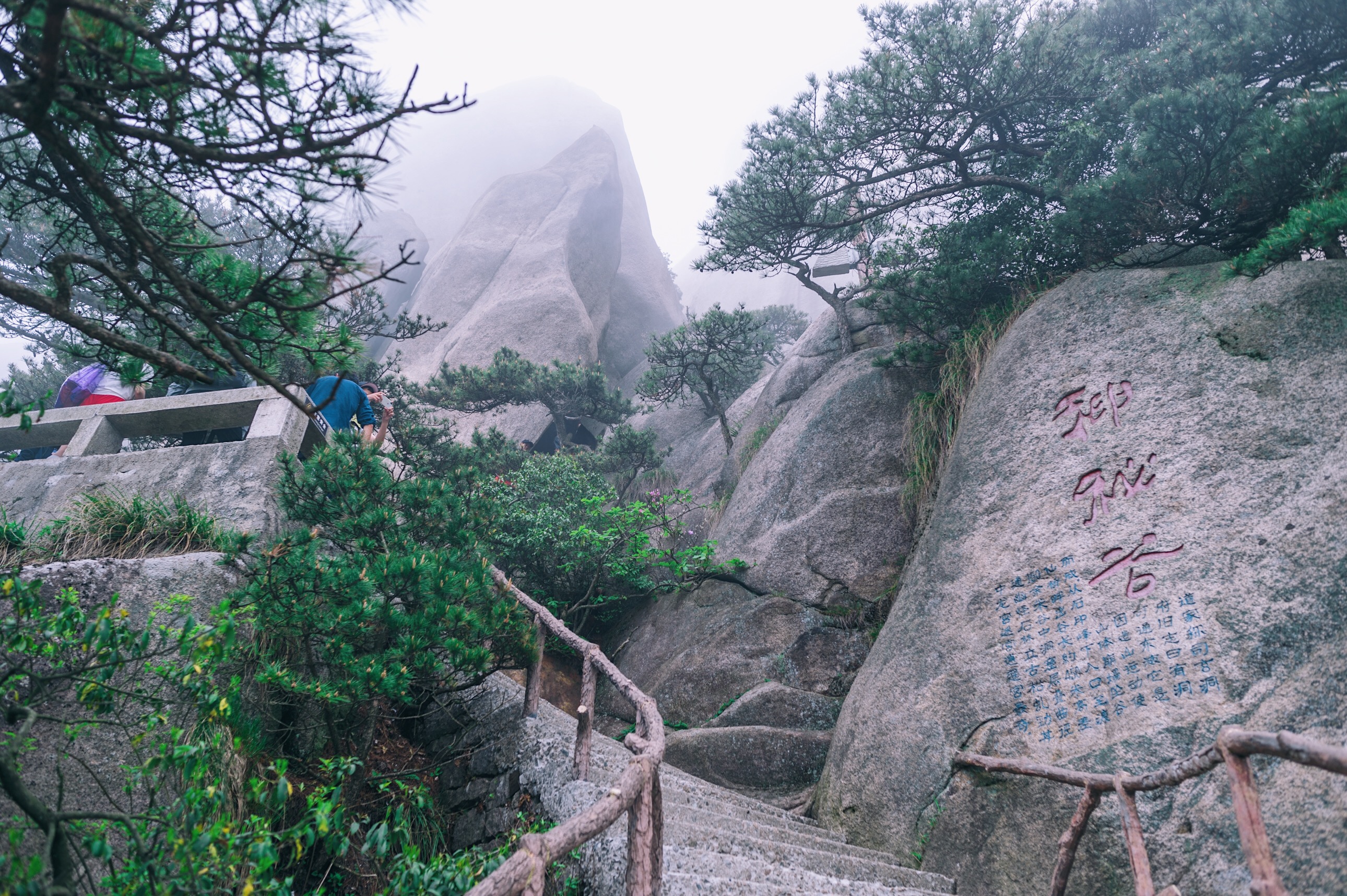 一路上悬崖、奇石、奇松、异洞、涧瀑和云海等等总是不间断的出现在面前,尤其是那些长在石缝里的迎客松,在陡峭的崖壁上、突兀的岩石上扎根、发芽、生长,不得不感叹生命的奇妙与坚强;还有千姿百态的石头,有些真的相似人工雕刻,捏造,奇形怪状,不得不感叹大自然的鬼斧神工。