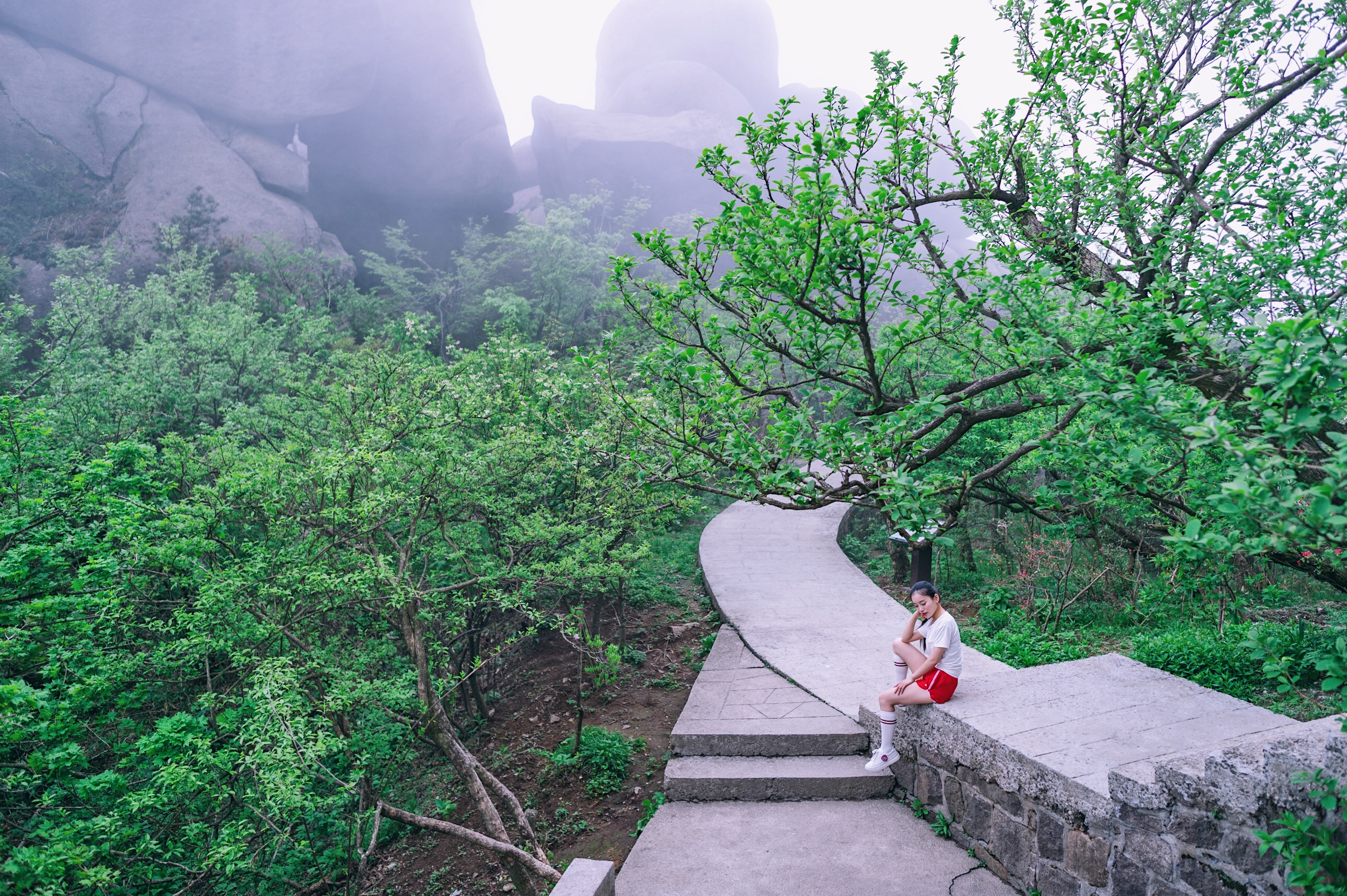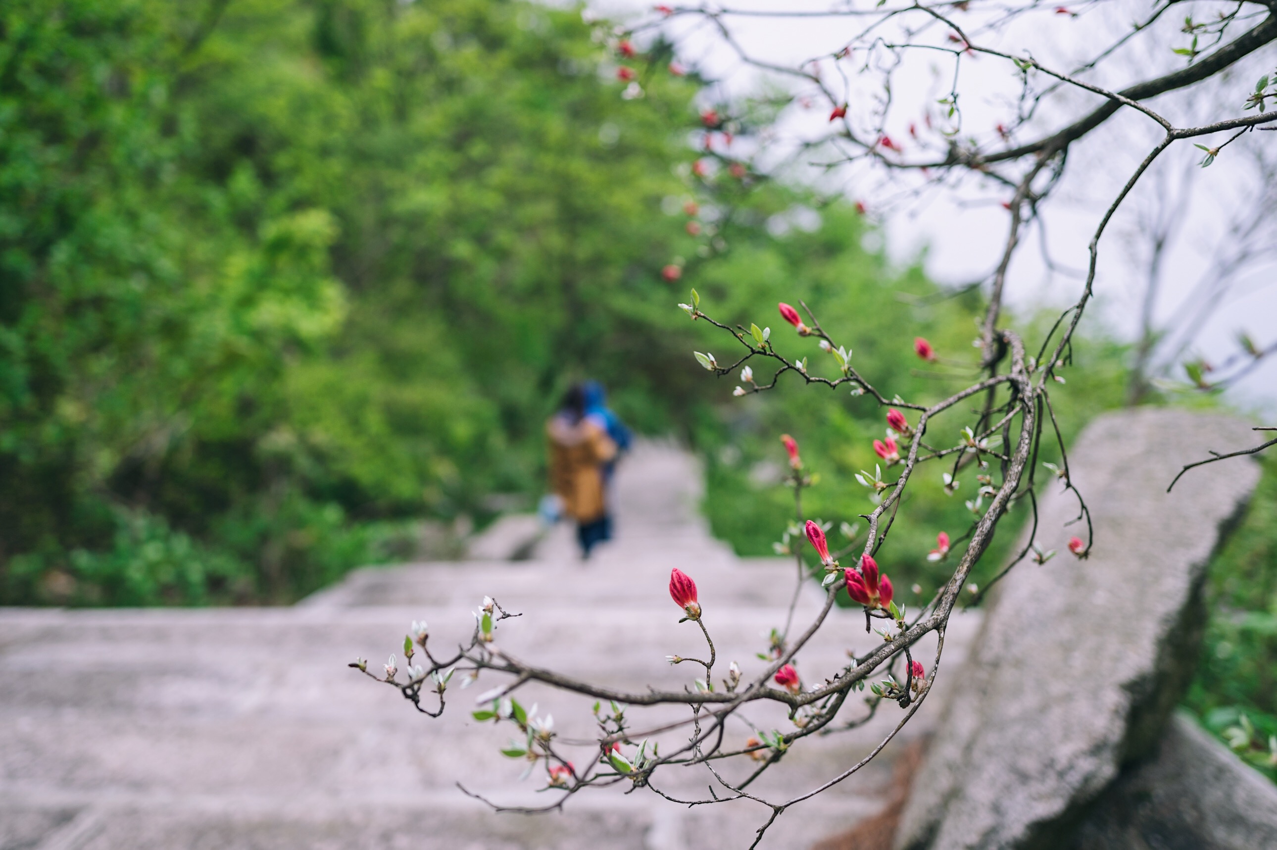 在登山路线中,时不时的出现一些很陡的楼梯和一些很平的道路,一路上也有很多供游客休息的凉亭,虽然整座山的高度不算矮,但是一路走下来也不会很累。沿途野生的杜鹃花已在悄悄的绽放,看着两旁的美不胜收的风景,呼吸着新鲜空气,也使得我们会暂时忘却了疲劳。