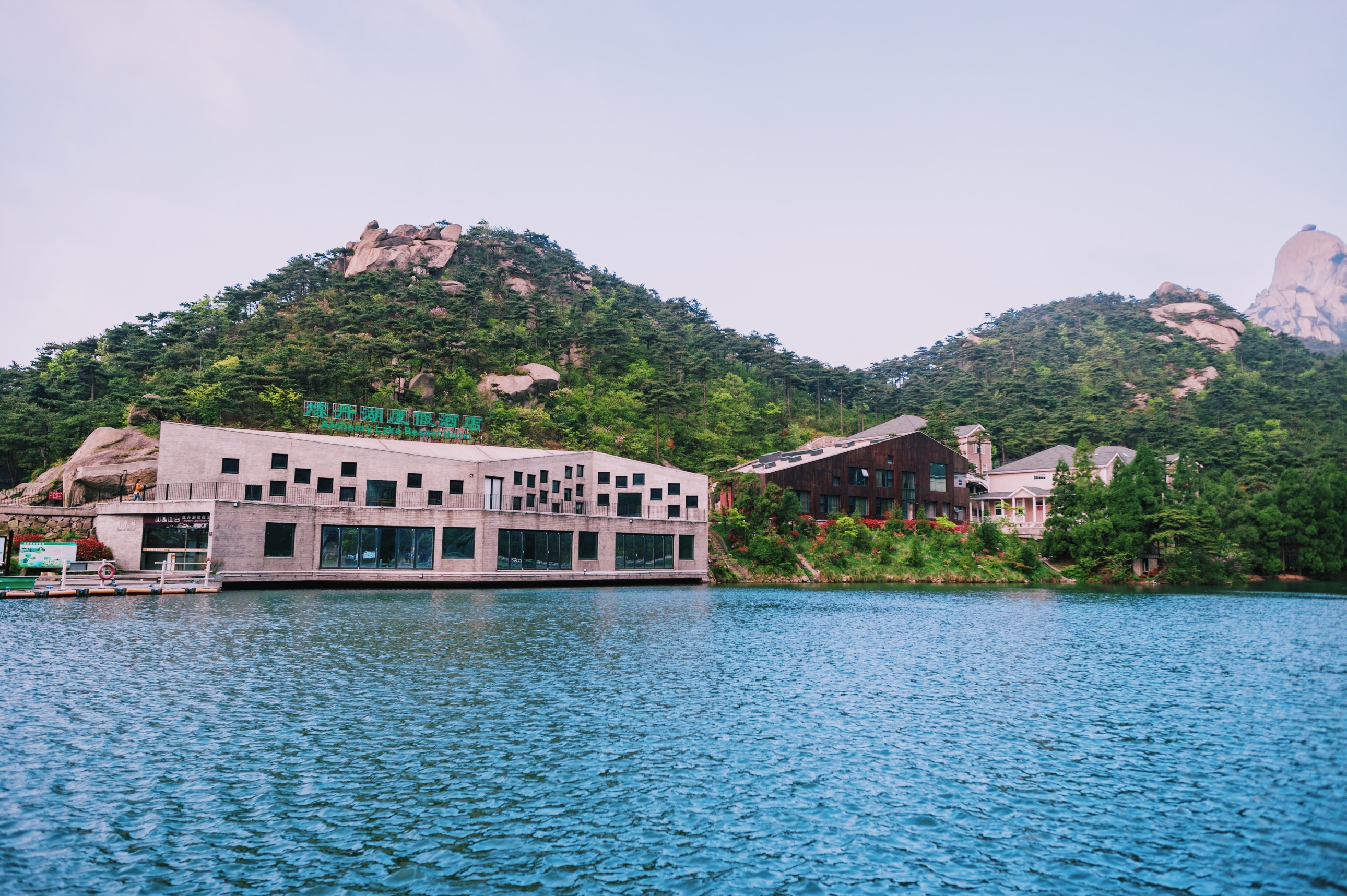 第二天爬 天柱山 想看看有机会在看日出,所以就打算住在山上,可是天气不给力。在山上可选择的酒店很少,最值得推荐的就是炼丹湖,因为它就在炼丹湖边上,依山傍水,坐拥整座炼丹湖,独享一片私人湖泊,好似属于自己的一片无边泳池,只可惜不能游泳。